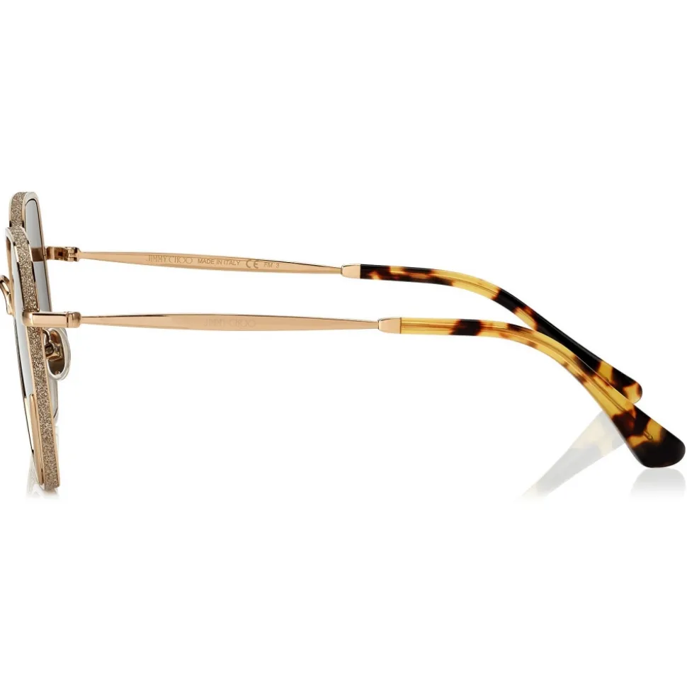 Characterised by its distinctive, desirable statement shape, Aline in grey shaded gold mirror will amp up your cool credentials. Designed with a square gold metal frame, front and temple, the thin rim is enriched by an iconic dusty glitter fabric and three dimensional detailing. Wear Alaine to impress on any sunny day.