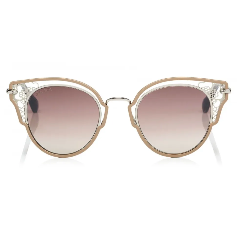 Inspired by iconic Jimmy Choo lace, Dhelia in nude and palladium metal is a must have statement piece. The stunning butterfly shape and silver mirror lenses make these the perfect accessory for chic daytime dressing.