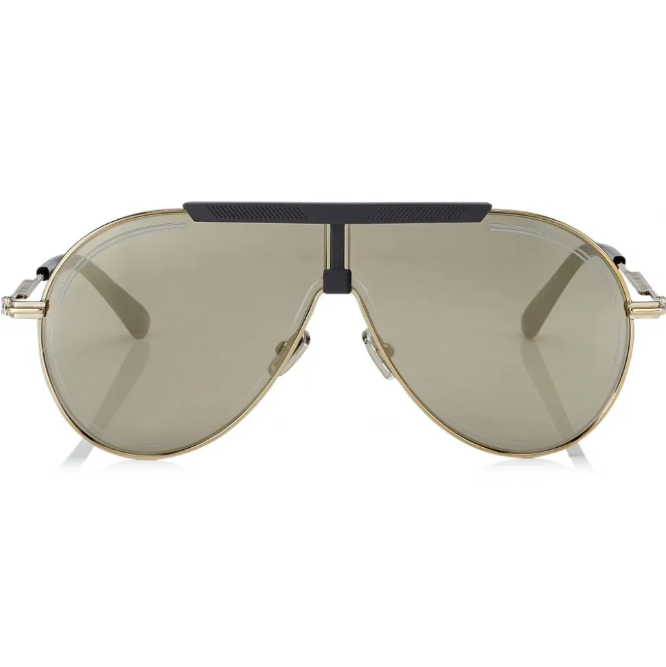 Add a retro vibe to sunny days with these Eddy aviator sunglasses. Comprising silver mirror lenses, a classic antique gold metal front frame and temples, and an acetate top bridge with arrow line design. Finished with a multifaceted light metal temple enriched by lasered logo, an arrow line design on top and grey and khaki accents.
