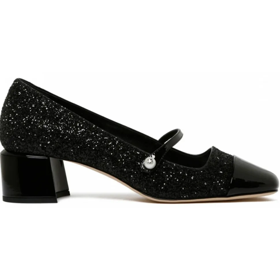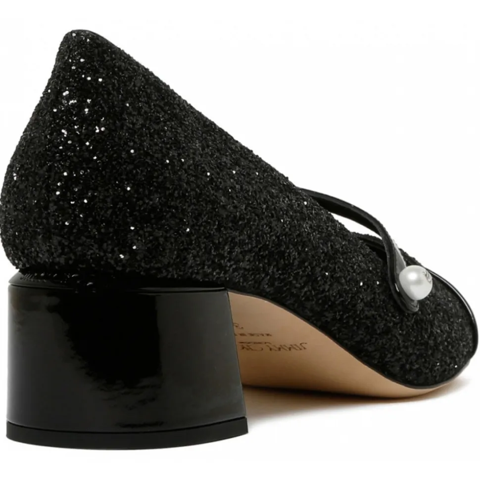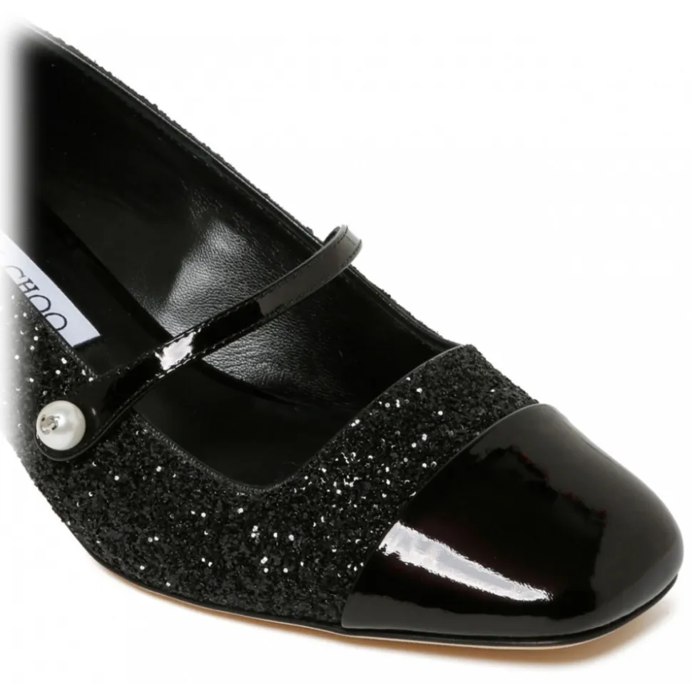 Jimmy Choo Black Elisa Pumps. Black agate pumps, glitter detailing, square toe. Patent finish tonal toecap, faux pearl embellishment, strap detailing. Low block heel, leather sole and slip on style.