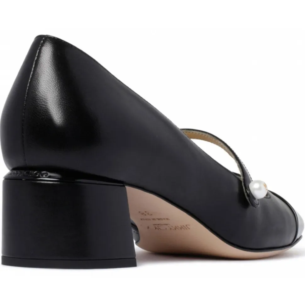 Jimmy Choo Black Elisa Pumps. Black leather pumps, patent panel, square toe. Button fastening straps, branded leather insole, mid block heel.