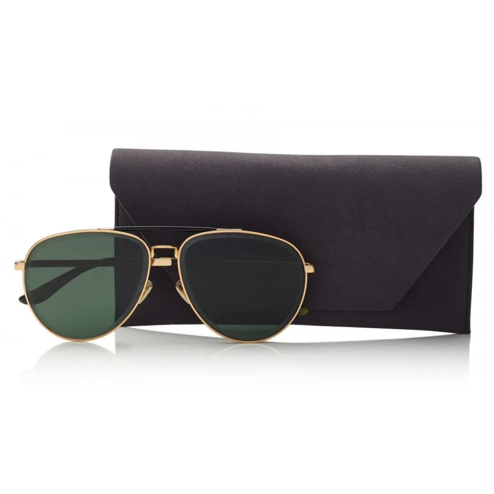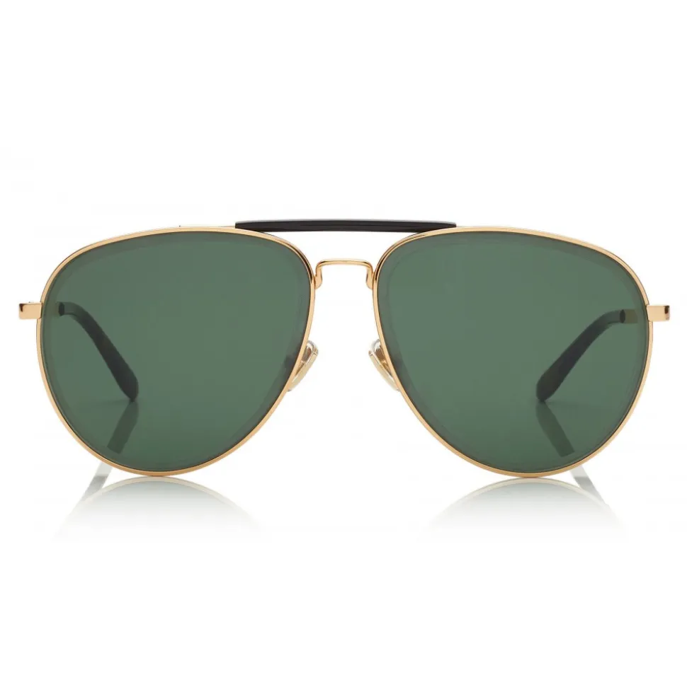 The Fin sunglasses in gold and black metal are a summer essential. Design in Italy, they feature camouflage tips, an internal Jimmy Choo logo and stylish green lenses.