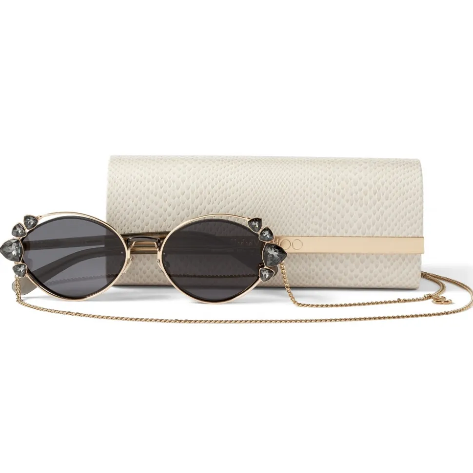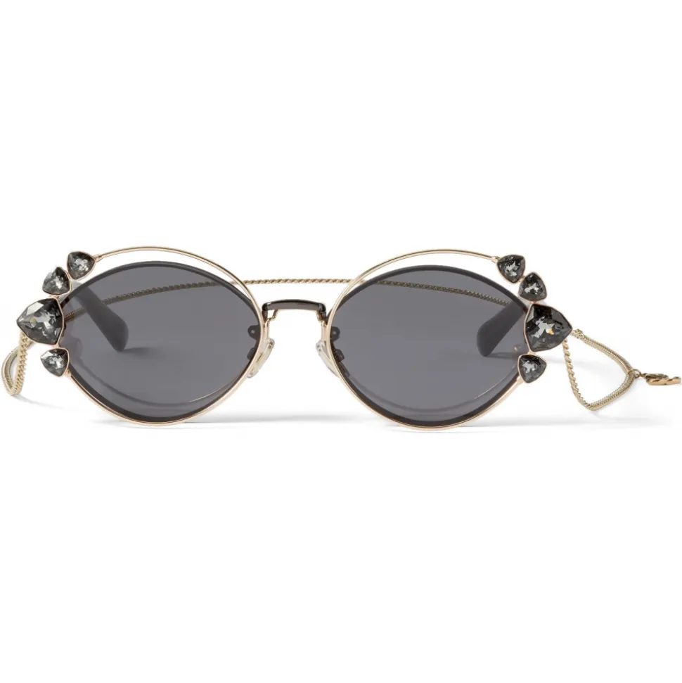 Our aptly named SHINE sunglasses are a glamourous pair that capture the playful spirit of the Jimmy Choo woman. This black ruthenium oval-shaped pair is characterised by a clip-on chain, complete with hand-applied Swarovski crystals and a signature JC emblem – detach yours to wear it as a necklace.