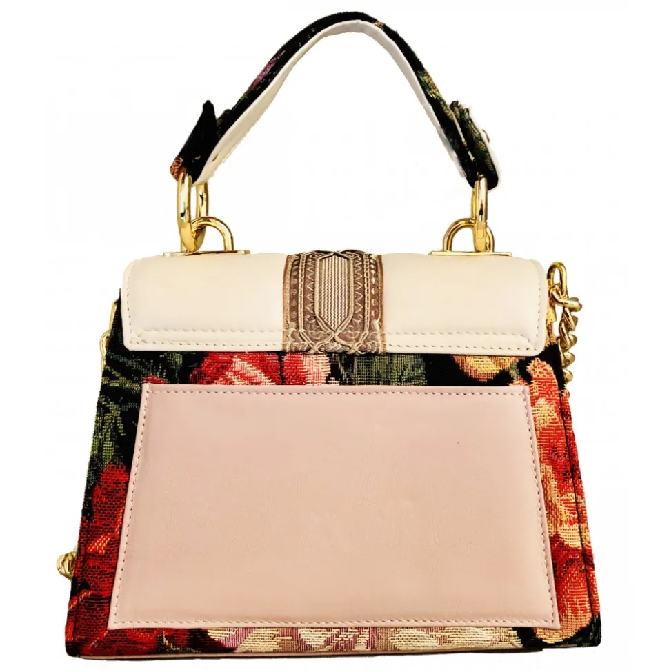 Jewel mini bag made with precious but durable jaquard fabric, French embroidered trimmings and high quality leather.