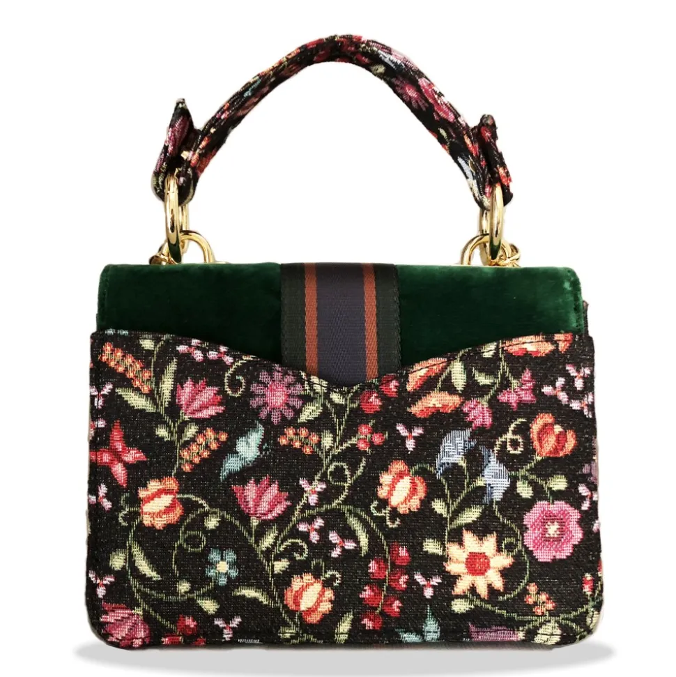 Kristina MC – Mini Bag Cahier – Clutch Shoulder Bag with Shoulder Strap in Chain – Velvet Gabardine Floral Fabric – Forest Green – High Quality Craft Accessory – Handmade in Italy – Fashion – Haute Couture