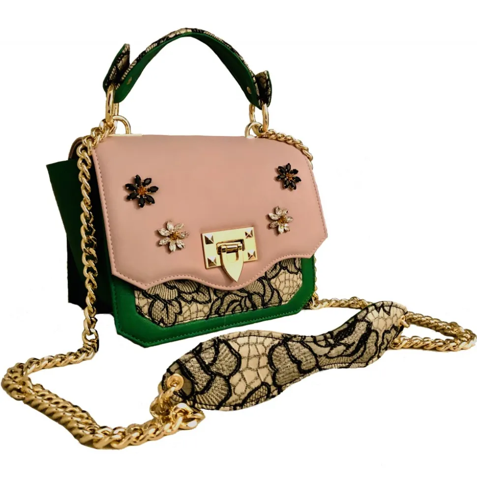 Kristina MC – Mini Bag – Clutch Shoulder Bag with Shoulder Strap in Chain – Nappa Leather and Double Floreal Jaquard Fabric – Swarovski – Pink Forest Green – High Quality Leather Craft Accessory – Handmade in Italy – Fashion – Haute Couture