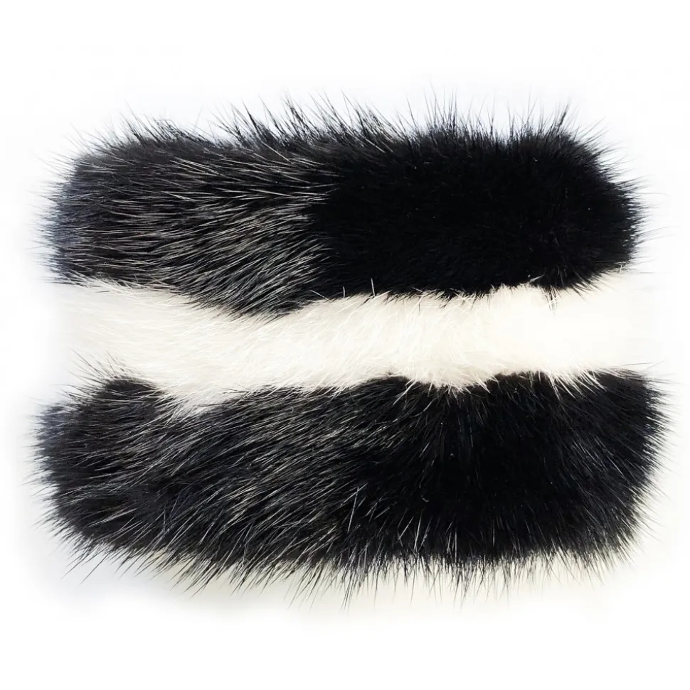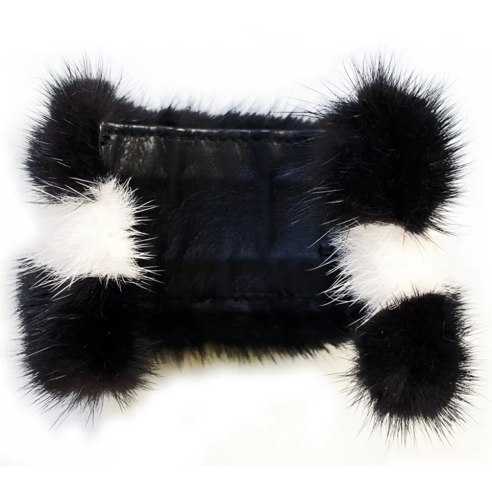 Orange mink fur bracelet with heart-shaped inlay in black mink. Internal metal core adjustable on the wrist. Covered in black nappa leather.