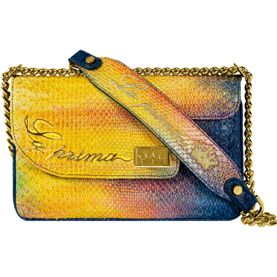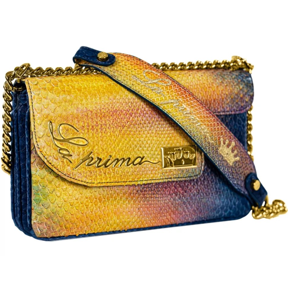 Saddle shoulder bag python hand painted blue and yellow color with golden details.