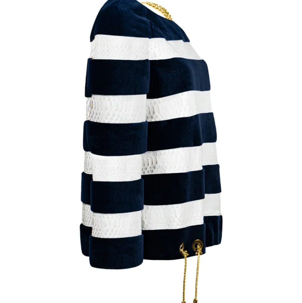 La Prima Luxury – Marina – One-Shoulder Fur in Shaved Blue Mink – Inserts in Optical White Python – Gold Plate Chain – Fur Coat – Luxury Exclusive Collection