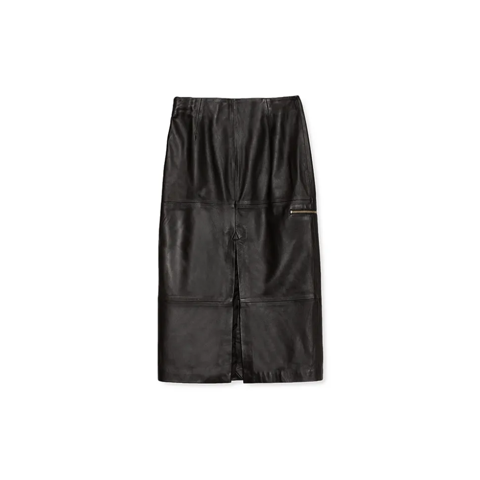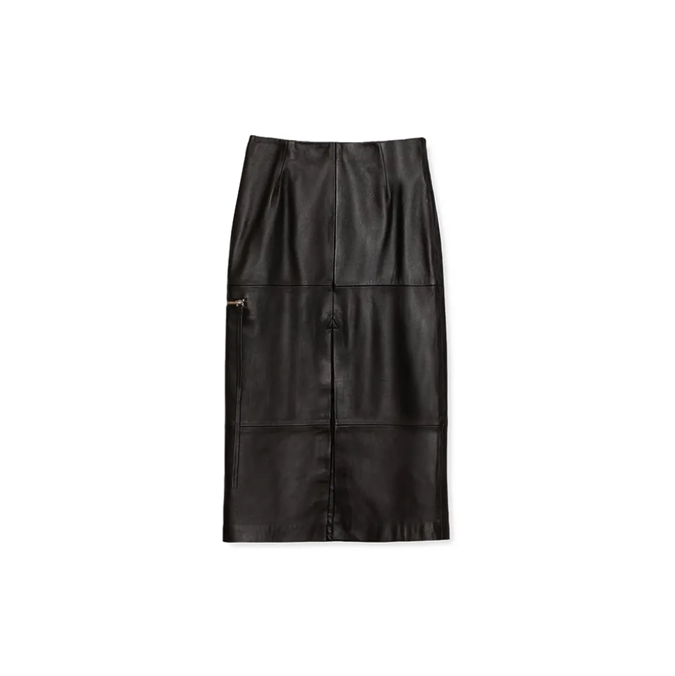 Adrogué skirt is made in soft lambskin leather; it has a deep slit in the center front and back and fitted waist. Cut to fall below the knee, it is fully lined and has a concealed side zipper.
