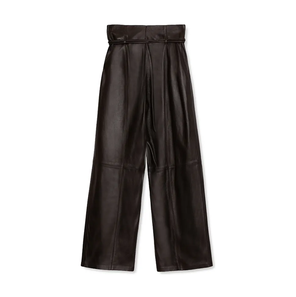 Bernal is our high-waisted straight cut lambskin slacks. Featuring front pockets and leather strap adjusting paper bag waist.