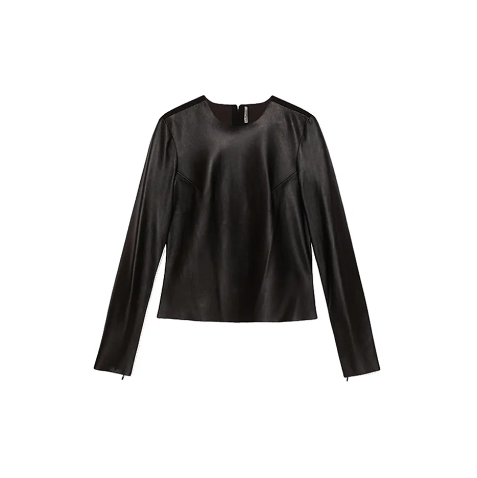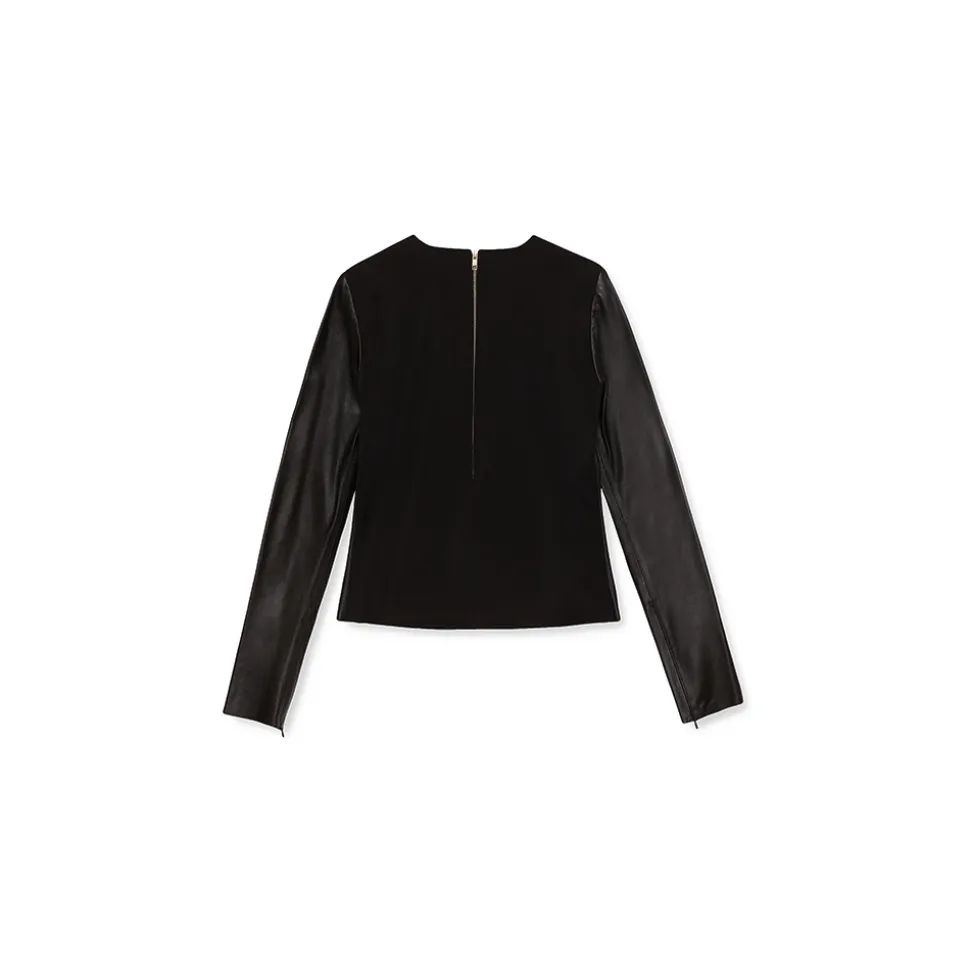 Esquel is our long-sleeve leather top with bonded lycra on the back for a perfect fit. It is detailed with invisible zipper closure inside the sleeves and a rear zip fastening.