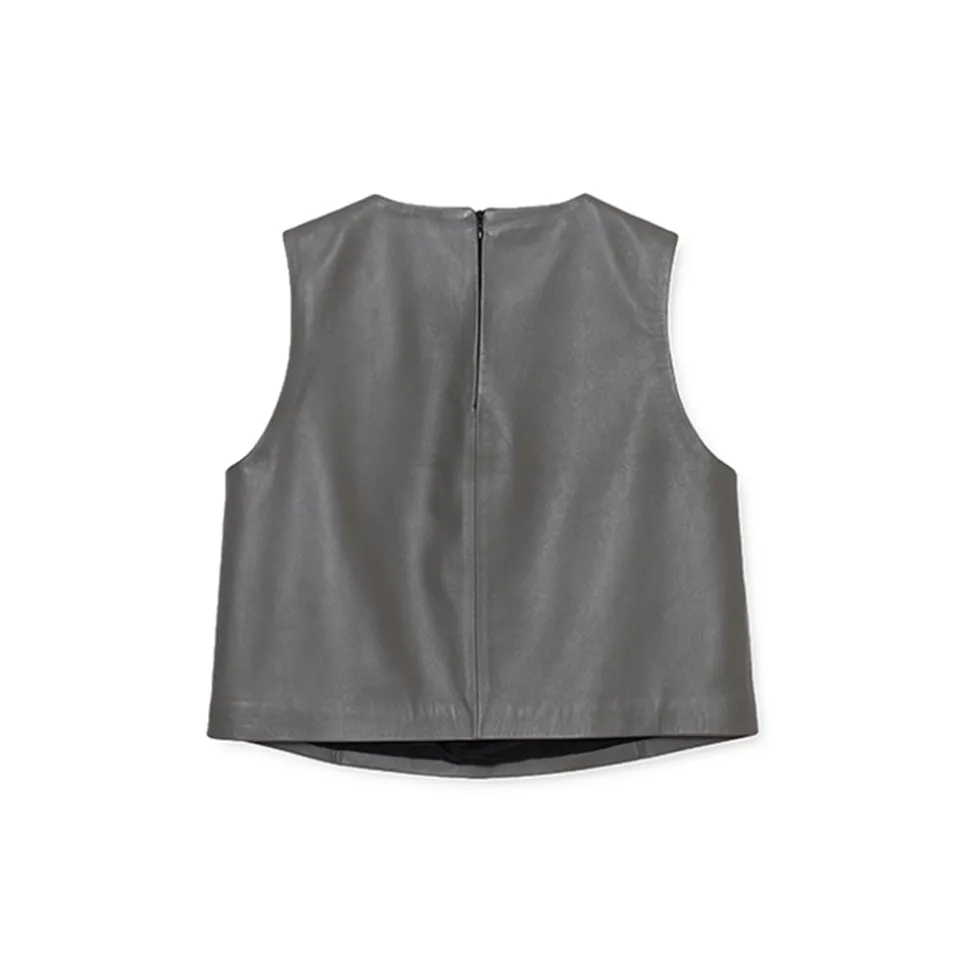 Lanús is our must have round neck, sleeveless lambskin leather top with invisible seams and a no-show zip closure.