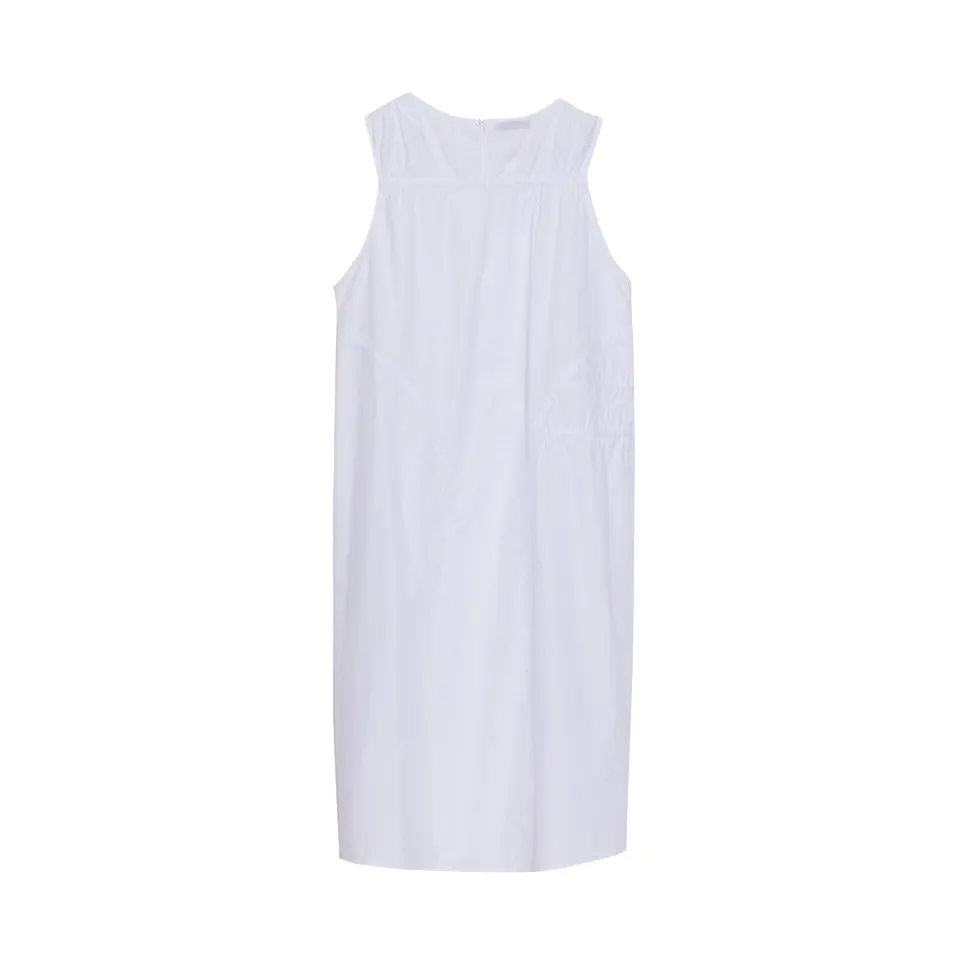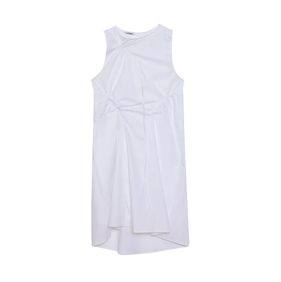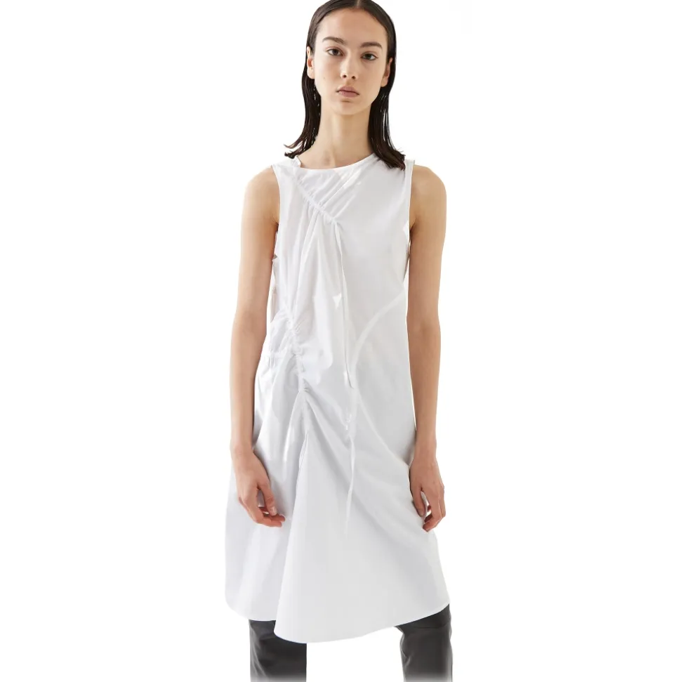 Lugano dress features an adjusting drawstring for a versatile t. It is sleeveless, round neck and made of beautiful poplin for daily wear.