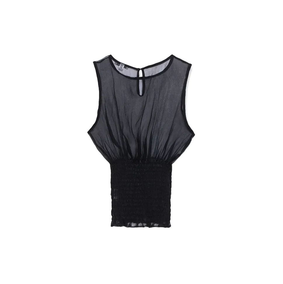 Sarandi is our round neck, sleeveless top made of beautiful luxury silk. Fitted at the waist with romantic smocking embroidery stitching.