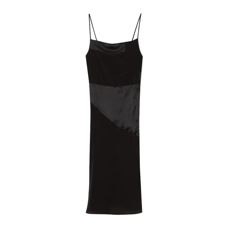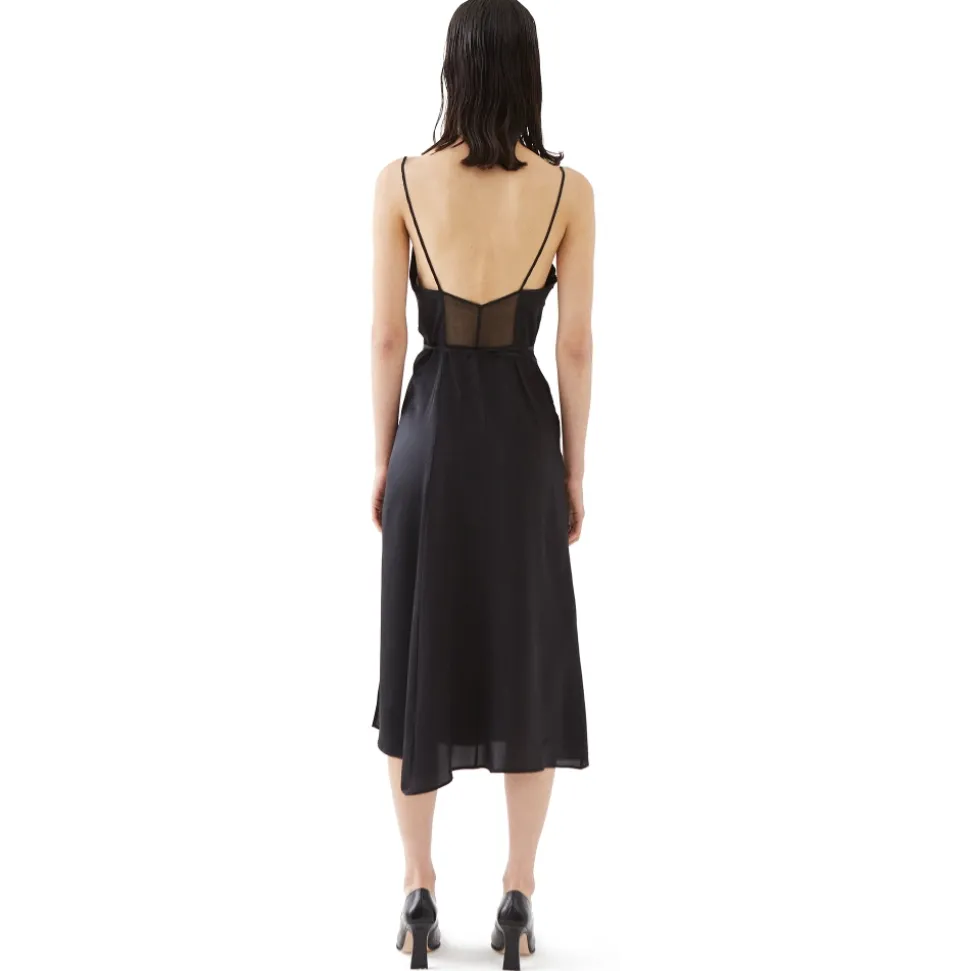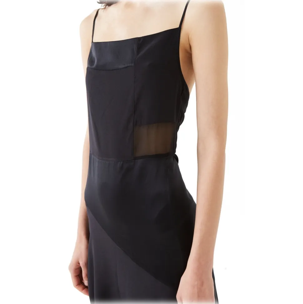 Our long black midi dress is made of different precious natural silks. Detailed with adjustable straps at the waist, a deep slit in the front and a fitted silhouette.