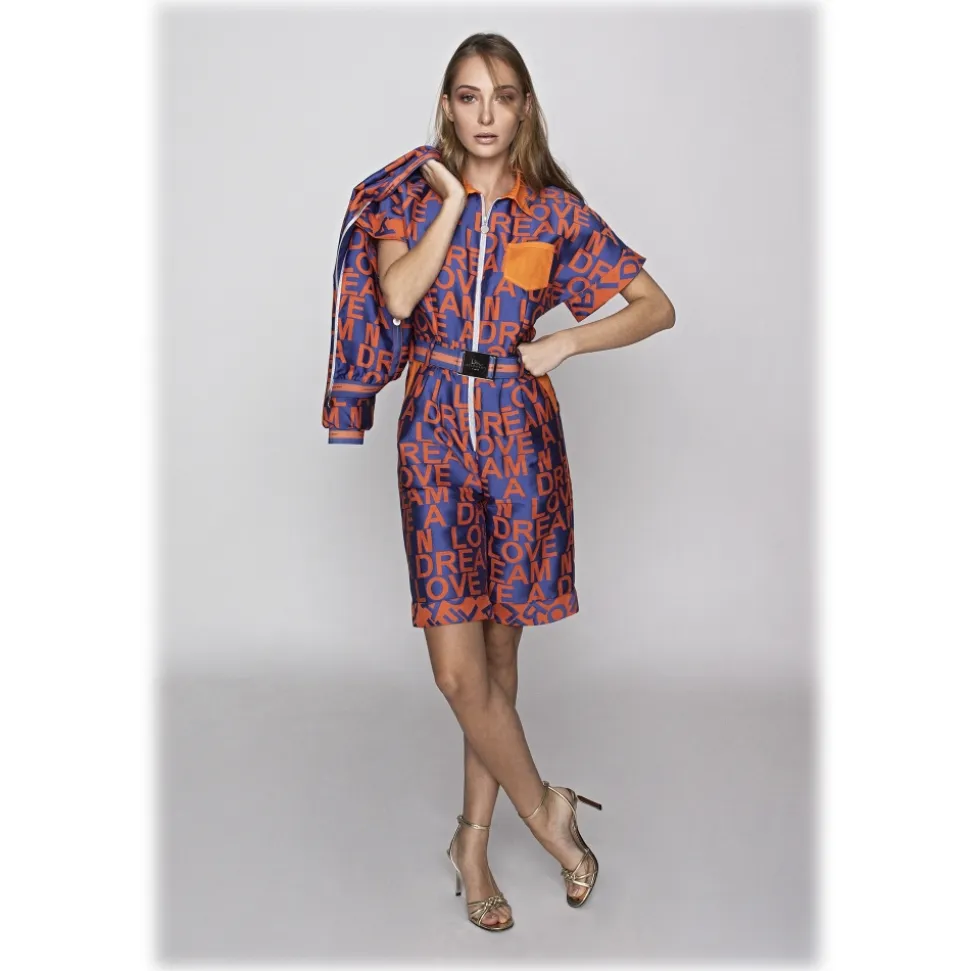 Love a Dream Barid jacquard fabric suit, with shorts inspired by the 80s, kimono sleeves. Detail pockets, breast pocket and orange collar.
