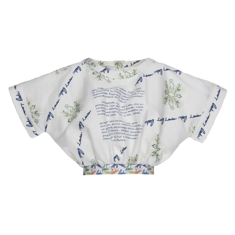Fanila. Crop top printed with kimono sleeves with “Leda” elastic band and phrase on the front.