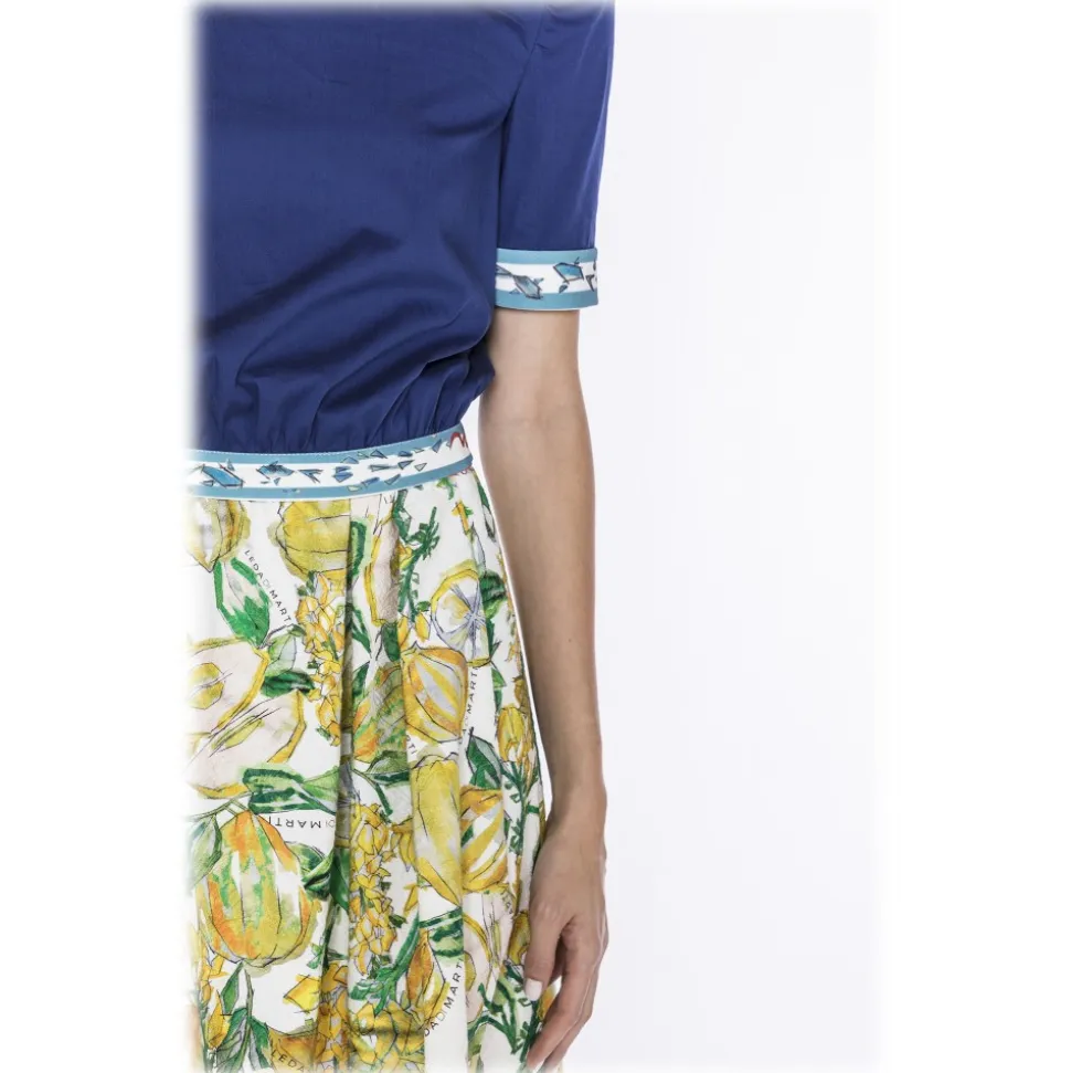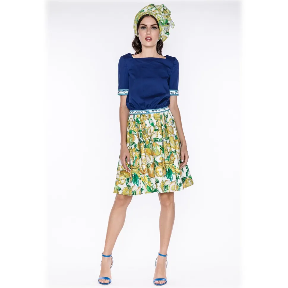 The knee length skirt Grampo, printed with the original Cedar print, has flat folds at the waist, an elastic printed easy-care waistband Ocean and hidden pockets.