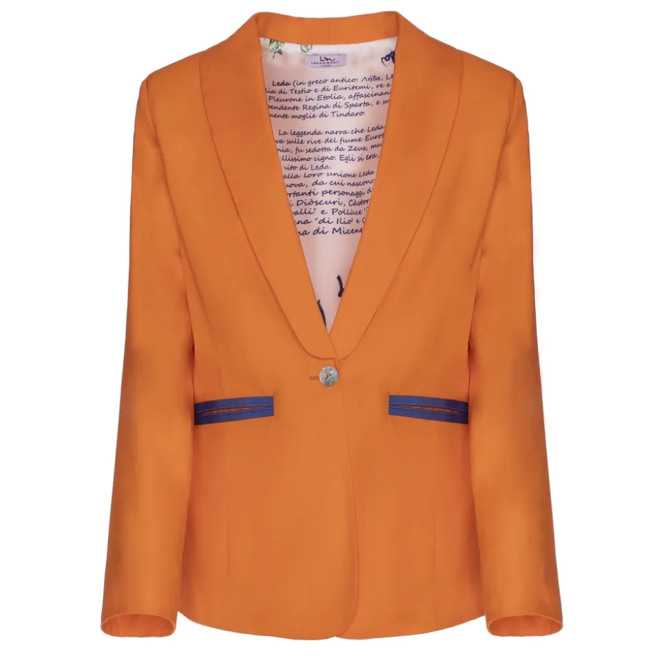 Haqiqa. Orange cotton jacket with purple printed pockets.