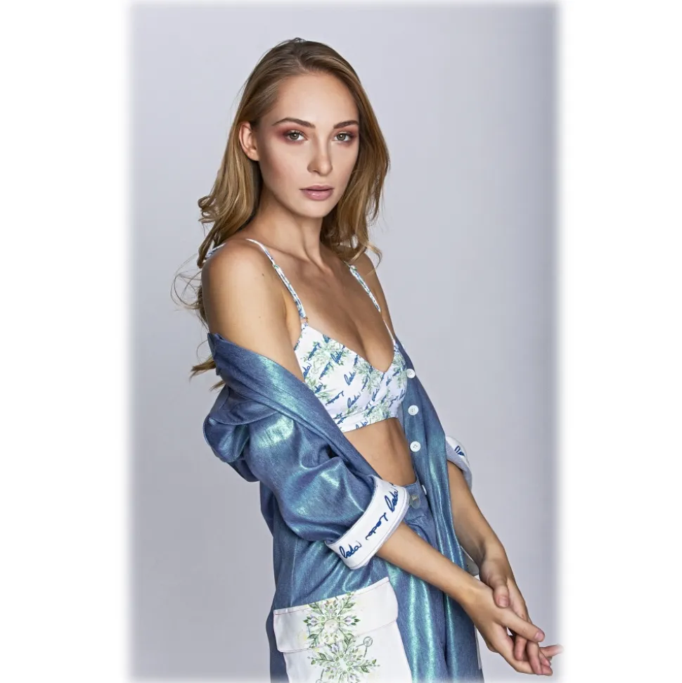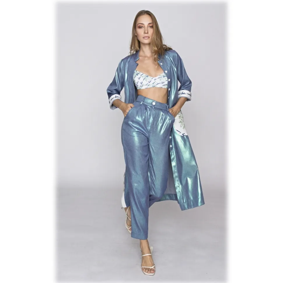 Our tags are not in paper, but in recycled material from the eyeglasses’ rods, with a mirror that makes them reusable, applied to a bag, like a real mirror. Our workforce is entirely Italian because the respect for traditions and for our sartorial excellence is a fundamental point of our DNA. The message of “Love a Dream” is not to waste and to buy with awareness, giving value to pieces that last over time and are to be collected. The collection is designed to be extremely versatile and interchangeable: for example, a laminated denim garment can be sporty when combined with a bomber jacket, for a day ofshopping with friends, or have an aggressive and seductive soul when combined with a printed silk satin top, for an unforgettable night.