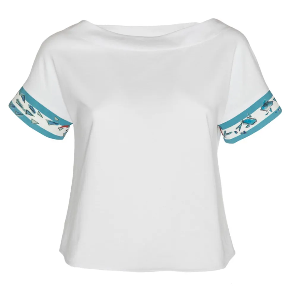 The LDM t-shirt is white, in simple and comfortable Italian cotton; has the boat neckline and the edges of the sleeves are decorated with the original Ocean print bands.