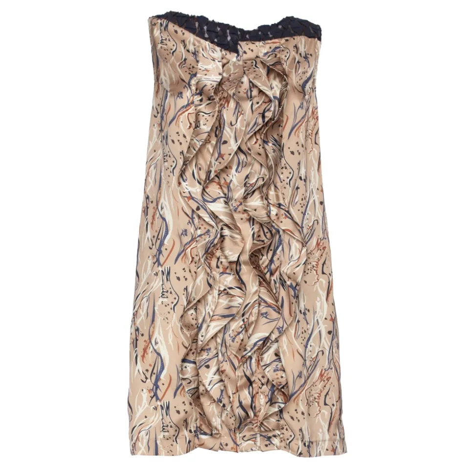 Short dress in beige printed satin without voilant sleeves on the front and back.