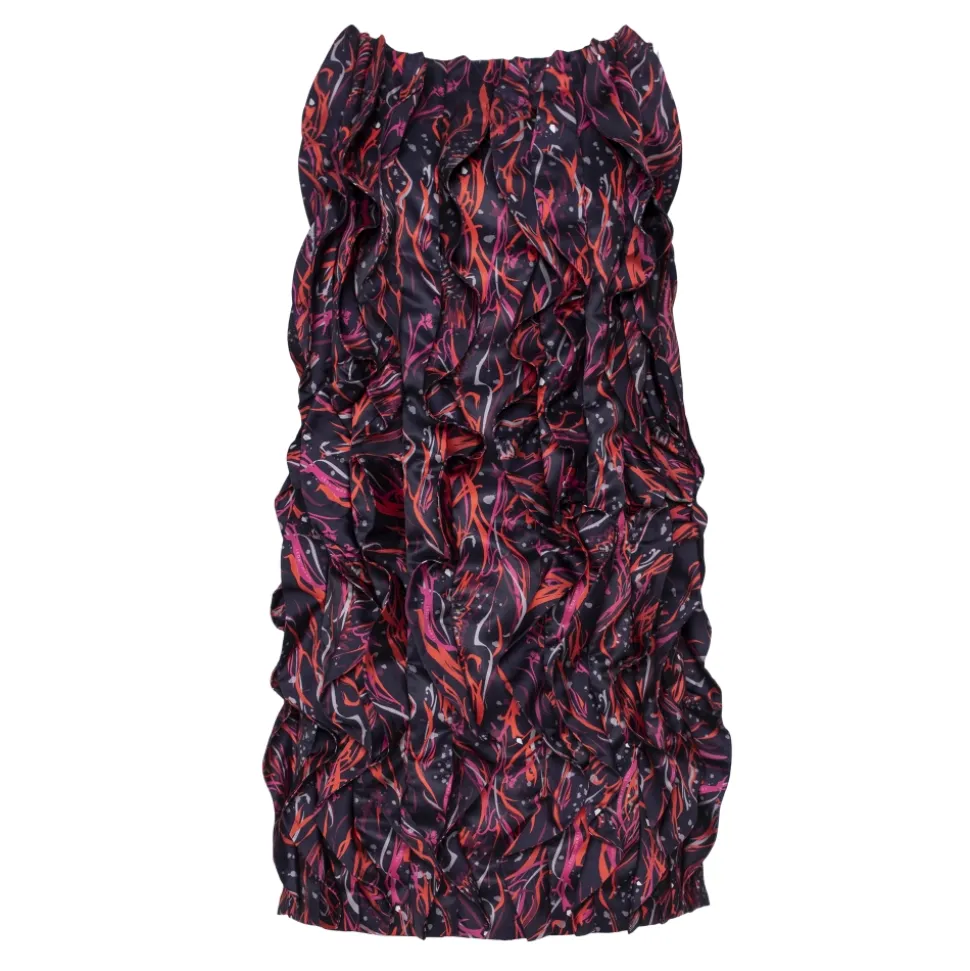 Short sleeveless dress in red printed satin with rouges.