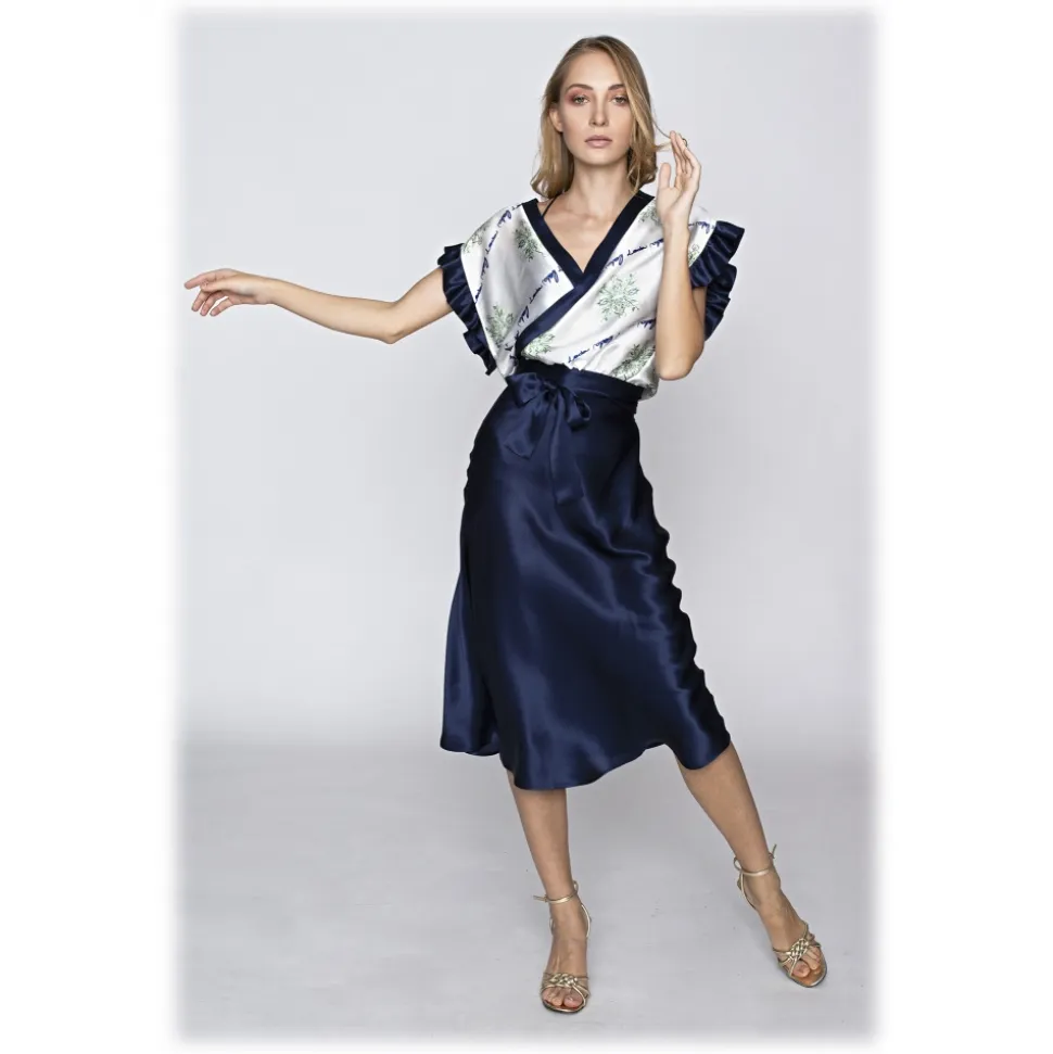 Rumantic. Printed top in pure silk with phrase on the back, Bow at the waist in pure navy blue silk. Sleeves with closed rouches.