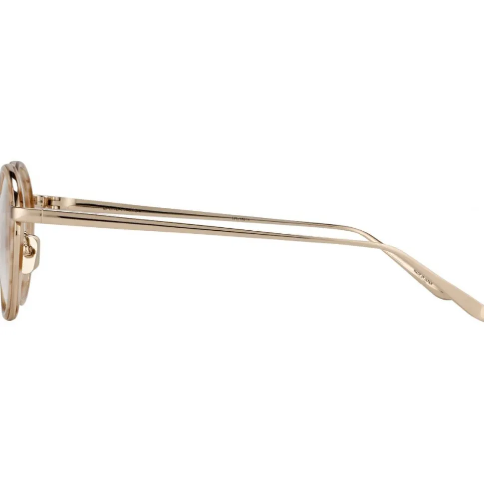 Slim titanium wire frame round glasses, handmade combining luxurious 22 carat gold plated titanium and hand moulded acetate. The lenses are contoured with a slim line of soft acetate, for a defined look, and an angular high wire bridge. The top-frame temples are sleek and simple, and feature sleek temples. The glasses are finished with the ‘Linda Farrow’ logo, printed in signature white on the inverted side of the temple.