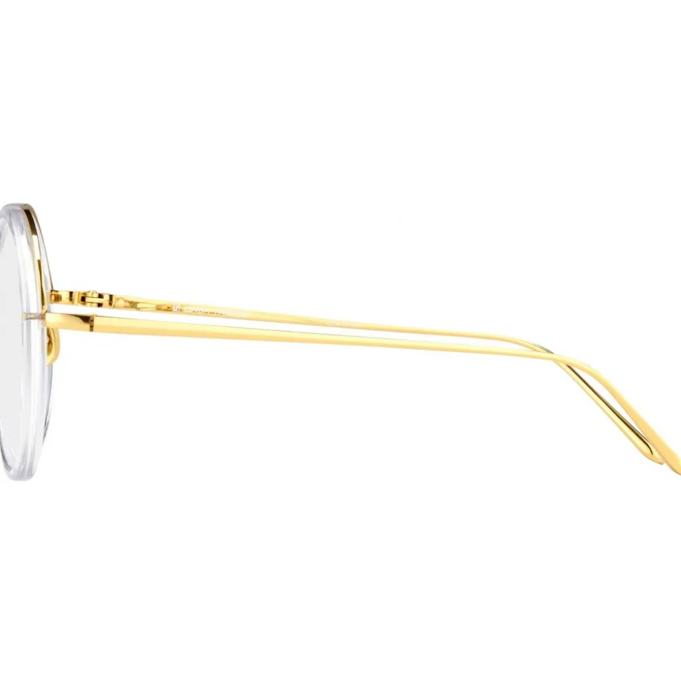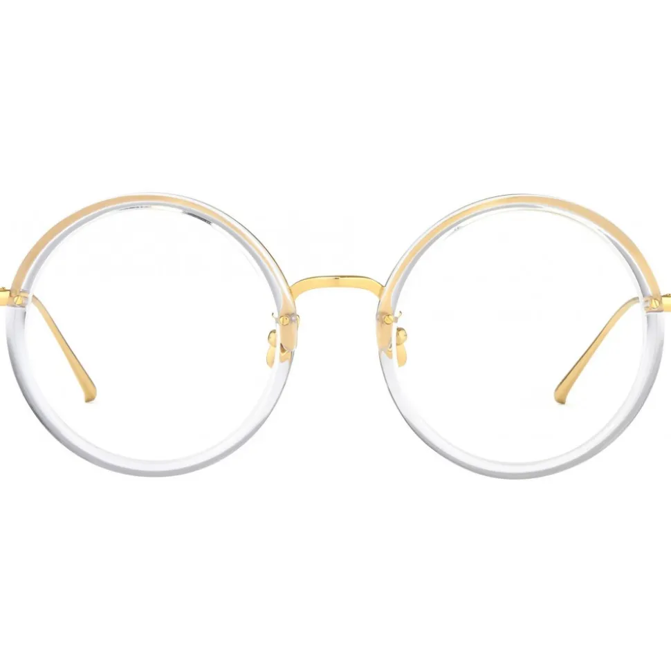 Optical unisex Linda Farrow glasses are handmade from a beautiful combination of 18-22 carat gold-plated titanium and clear Japanese acetate frames. Gold-plated lightweight titanium runs along the back of the frame and into the temples for a sophisticated contrast, finished with characteristic curved Japanese bulb tips and adjustable nose pads for added comfort. Signature raised pins and the Linda Farrow logo on the inverted side of the temple complete this timeless design.