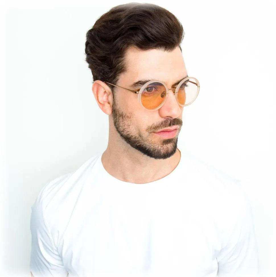 In an oversized round silhouette, these unisex round Linda Farrow optical glasses are the epitome of retro-luxe styling. 18 – 22 carat rose gold-plated lightweight titanium runs along the back of the milky peach Italian acetate frame and into the temples for a sophisticated contrast, finished with characteristic curved Japanese bulb tips and adjustable nose pads for added comfort.