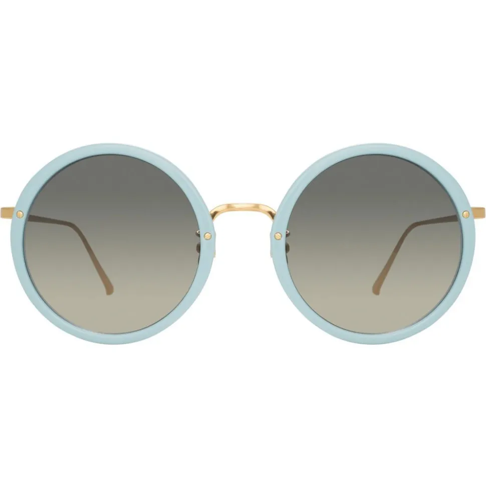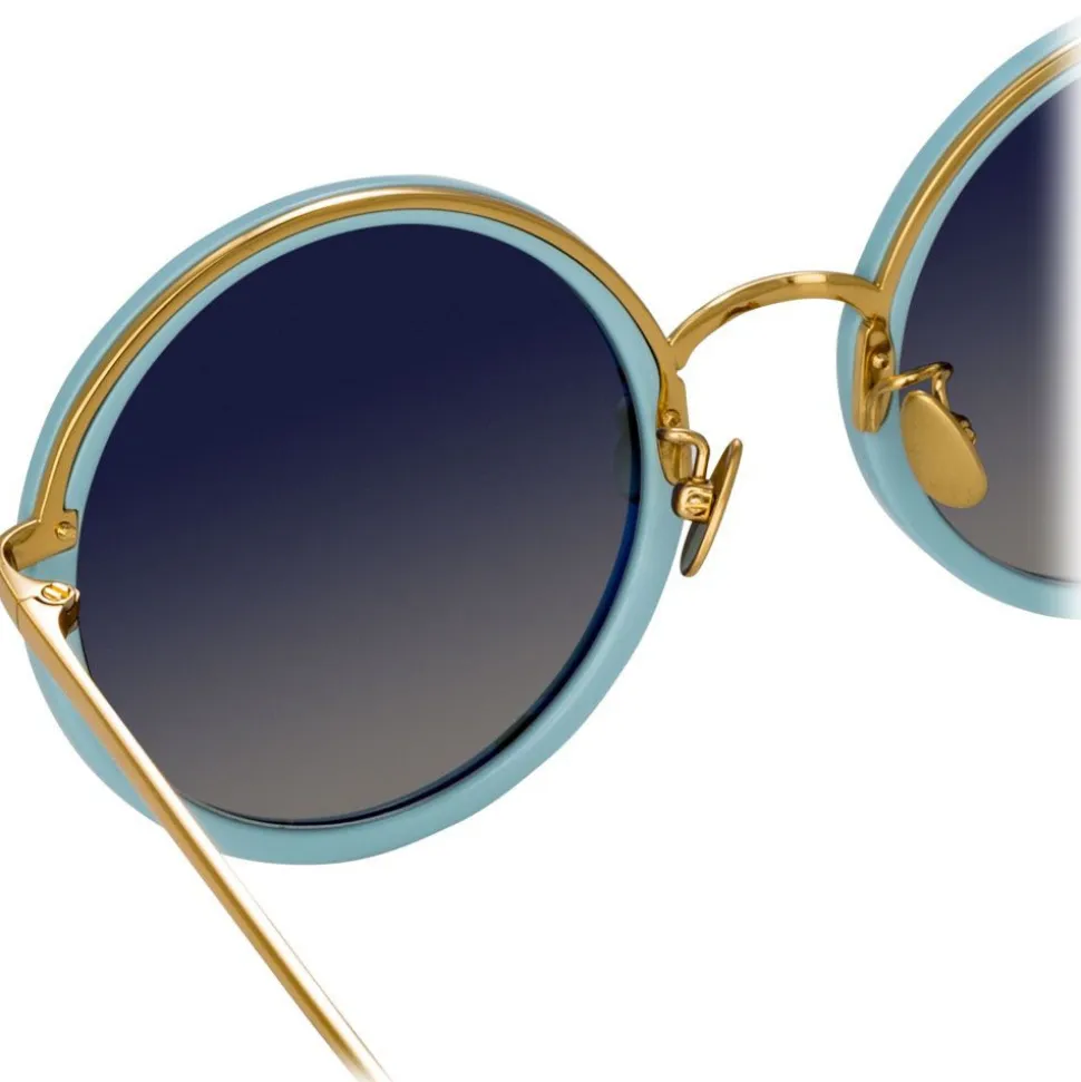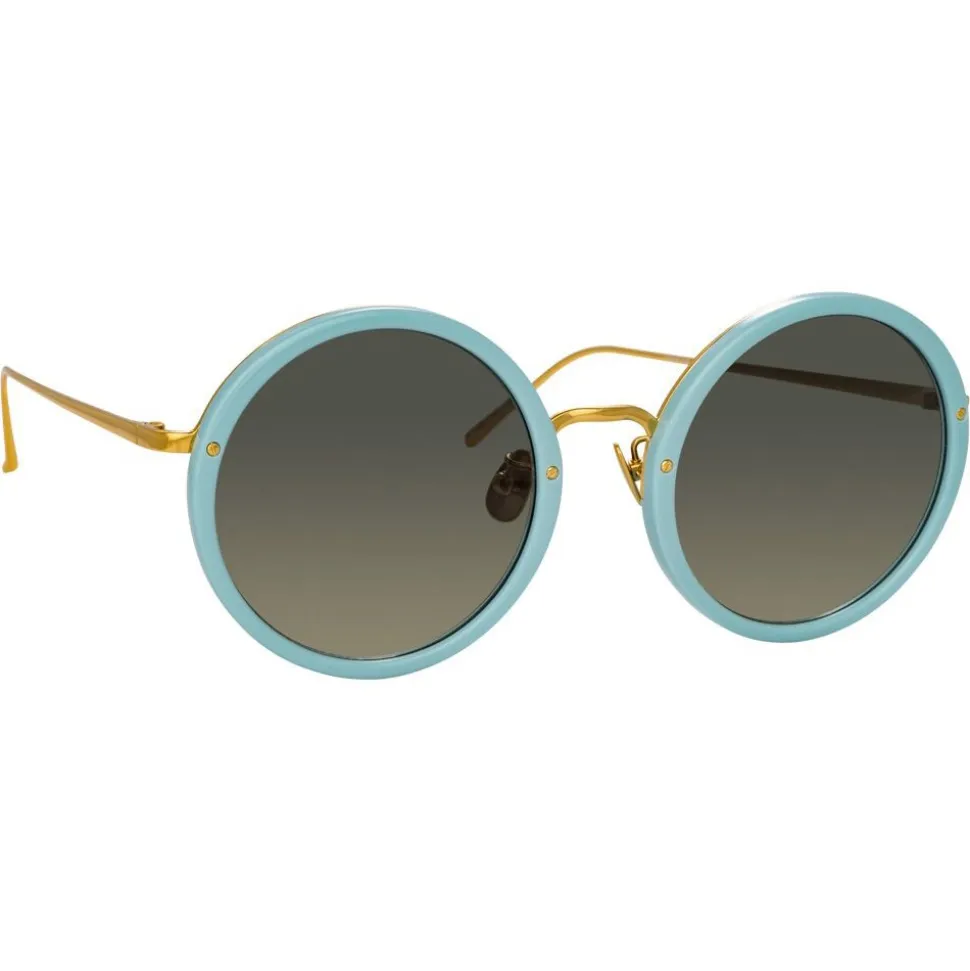 Handmade from a beautiful combination of 18-22 carat yellow gold-plated hypoallergenic titanium and porcelain blue Italian acetate, these unisex round Linda Farrow sunglasses take inspiration from the poolside elegance of the jet set captured by Slim Aarons.