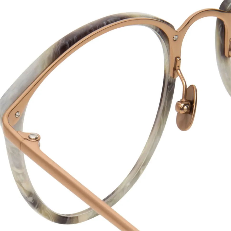 Taking inspiration from vintage styling, these oversized oval optical glasses from Linda Farrow are handmade from an elegant combination of grey marble Italian acetate and 18-22 carat rose gold-plated titanium, which runs along the back of the acetate frame and into the temples. Finished with characteristic curved Japanese bulb tips and adjustable nose pads for added comfort, this imitable pair are complete with signature raised pins and the Linda Farrow logo on the inside of the temple.