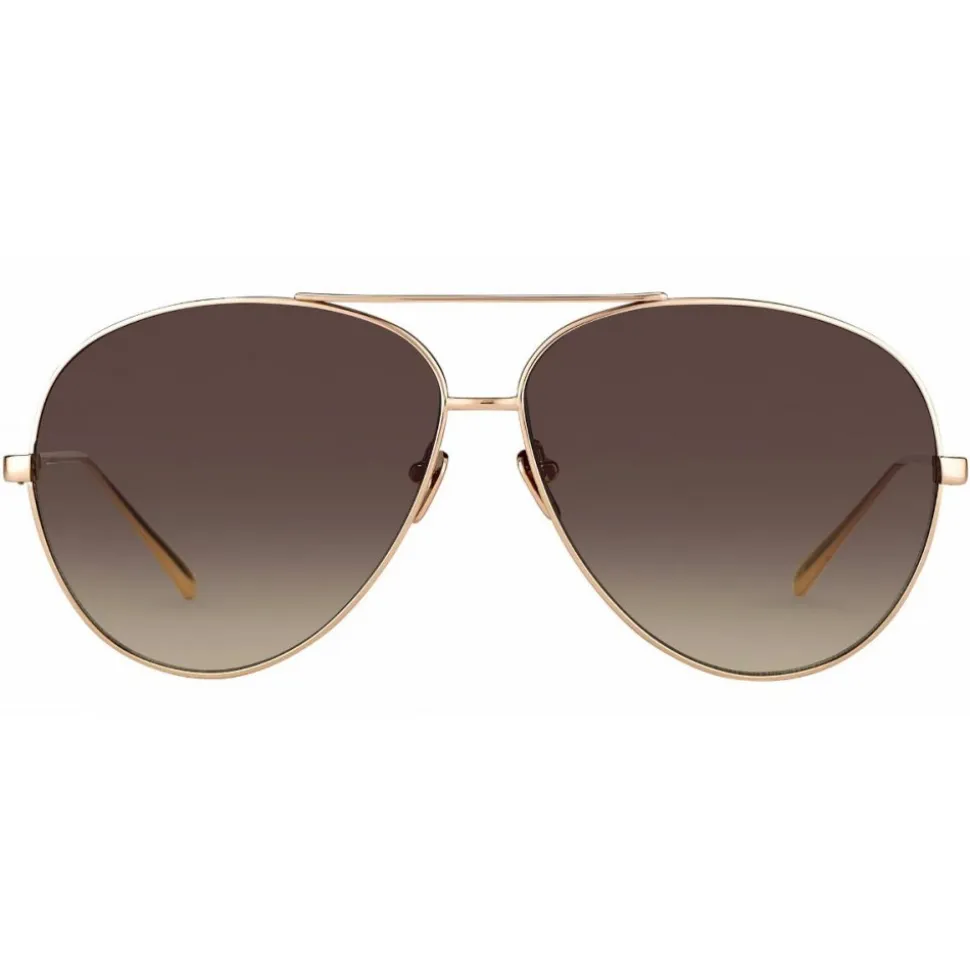 These classic unisex Linda Farrow aviator sunglasses are handcrafted from matt yellow gold Japanese lightweight titanium. Slim rims hug the lenses, complete with a signature double bridge and sleek temples.