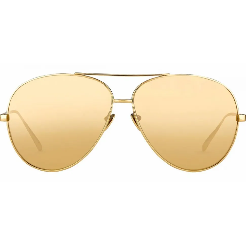 These classic unisex Linda Farrow aviator sunglasses are handcrafted from matt yellow gold Japanese lightweight titanium. Slim rims hug the lenses, complete with a signature double bridge and sleek temples.