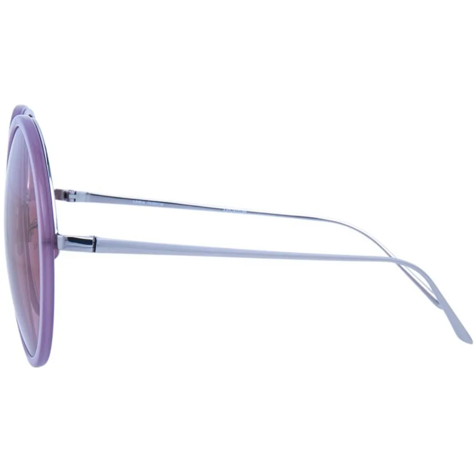 The epitome of elegance, these Linda Farrow round sunglasses are handcrafted from Italian acetate in milky purple, with metal running behind the framework for added strength. With purple nylon lenses, these sunglasses are accented with contrasting 18 – 22 carat white gold-plated slim titanium temples, finished with signature raised pin details.