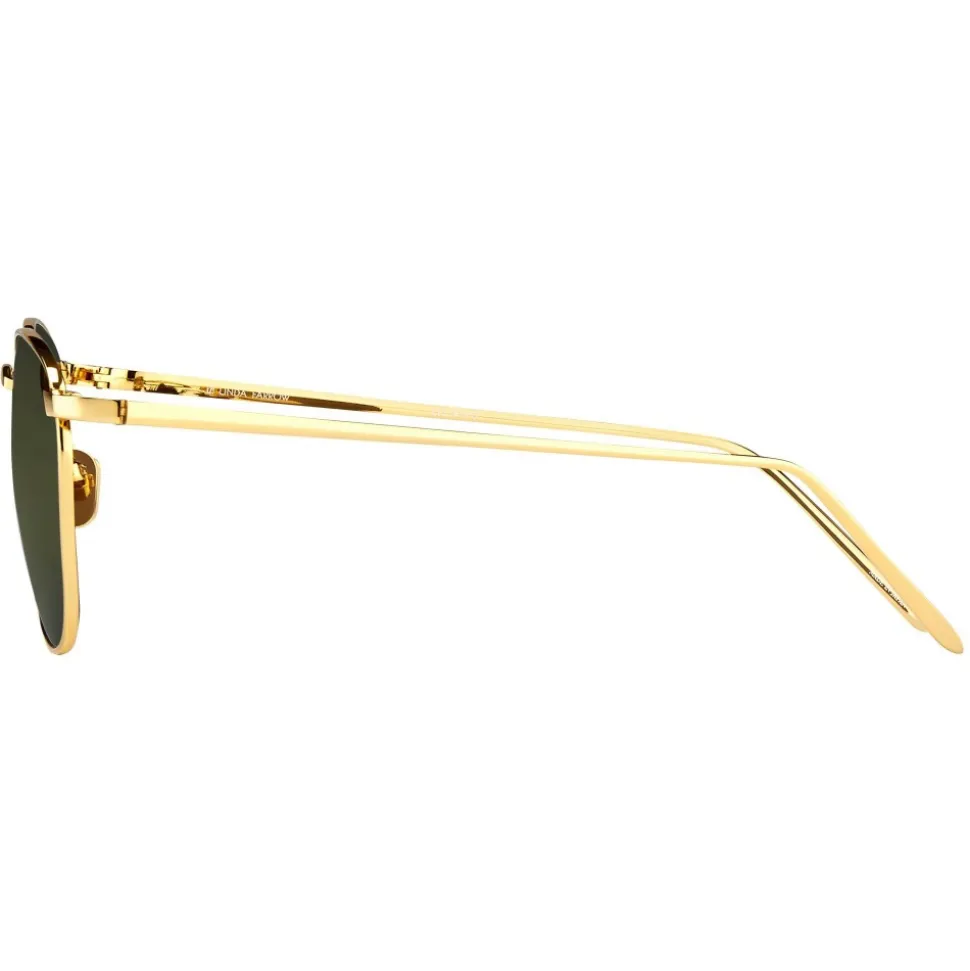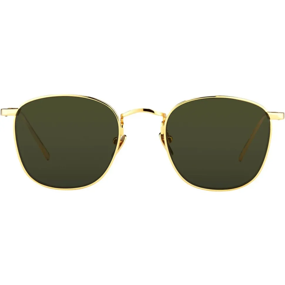 Handcrafted entirely from 18-22 carat gold-plated Japanese titanium, these Linda Farrow square browline sunglasses are the epitome of modern luxury. With contrasting solid green lenses, the sleek, lightweight temples are attached at the top of the frames.