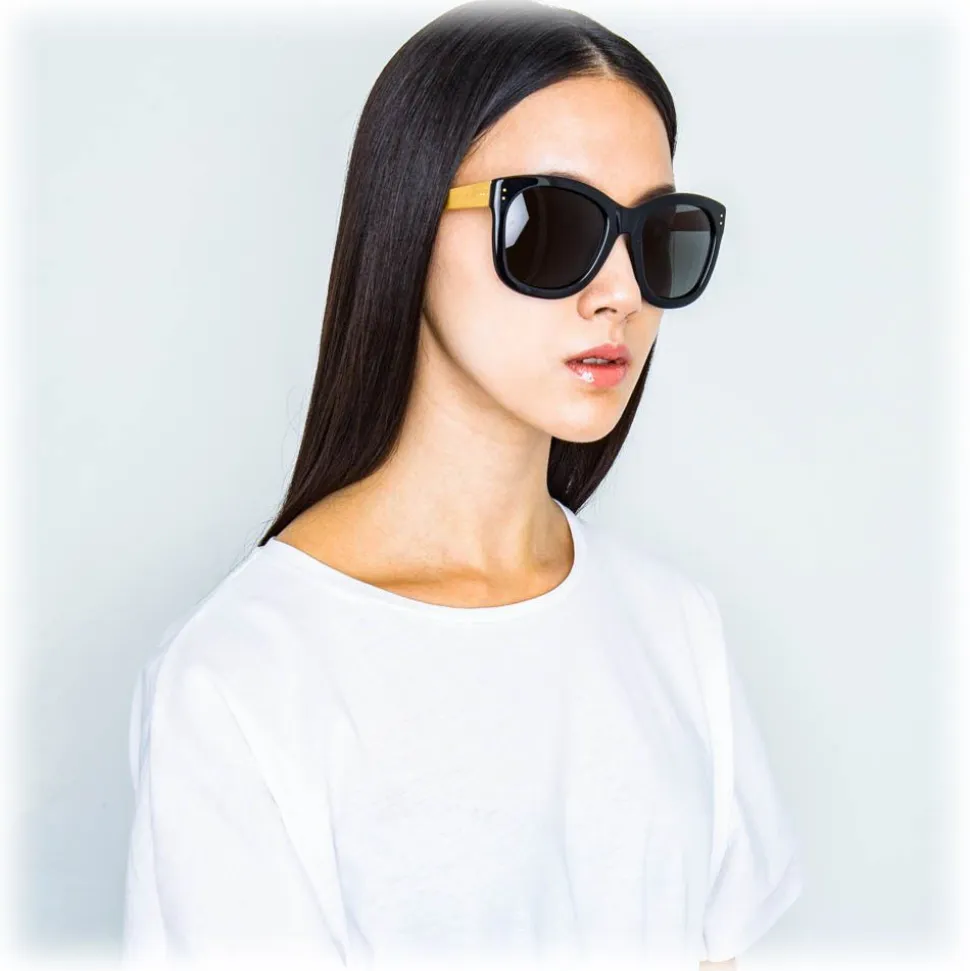 Taking inspiration from raw elements found in nature, these oversized D-frame sunglasses from Linda Farrow are crafted from a combination of hand polished, high-shine Italian acetate in black and ebony wood. Ebony wood temples are finished with hand-applied 24 carat gold leaf, a delicate technique new to eyewear so intricate that only 10 pairs can be made per day. With classic grey nylon lenses, gold capped hinges and raised pins complement this sophisticated style.