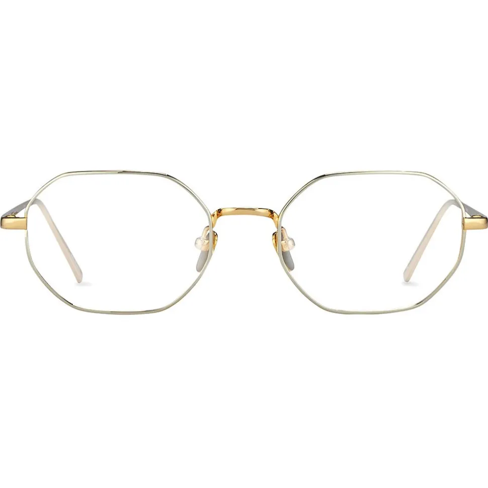 Fusing directional design with unparalleled hand-craftsmanship, these unisex angular Linda Farrow optical glasses are made from 18-22 carat gold-plated Japanese titanium. Rims in white gold are contrasted with a yellow gold nose bridge and slim temples, complete with Japanese bulb tips and adjustable nose pads for superior comfort. This style is finished with the Linda Farrow logo in white on the inverted side of the temple.