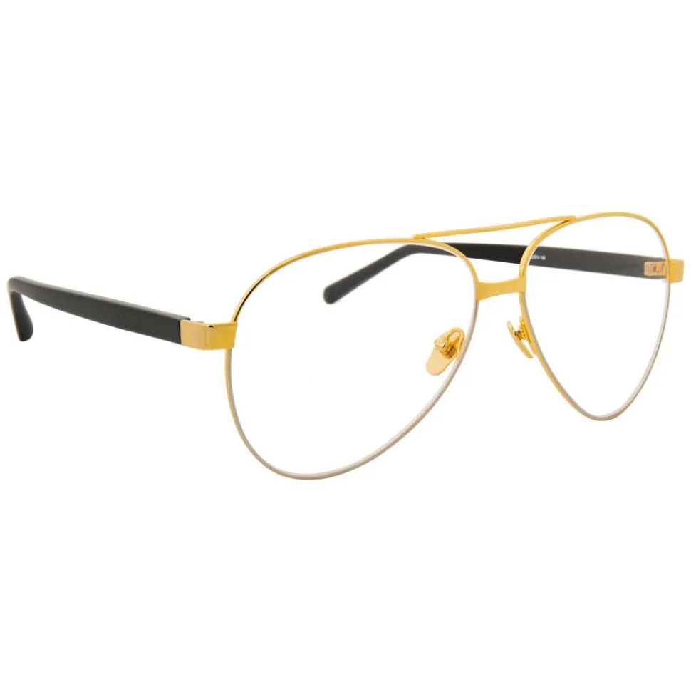 Luxurious, retro-inspired Linda Farrow aviator optical glasses crafted with hypoallergenic, lightweight 18-22 carat yellow to white gold plated Japanese titanium frames and temple caps. Black Italian acetate temples are complete with signature pointed Japanese bulb tips and adjustable nose pads to provide additional comfort, finished with the Linda Farrow logo printed on the inside of the temple.