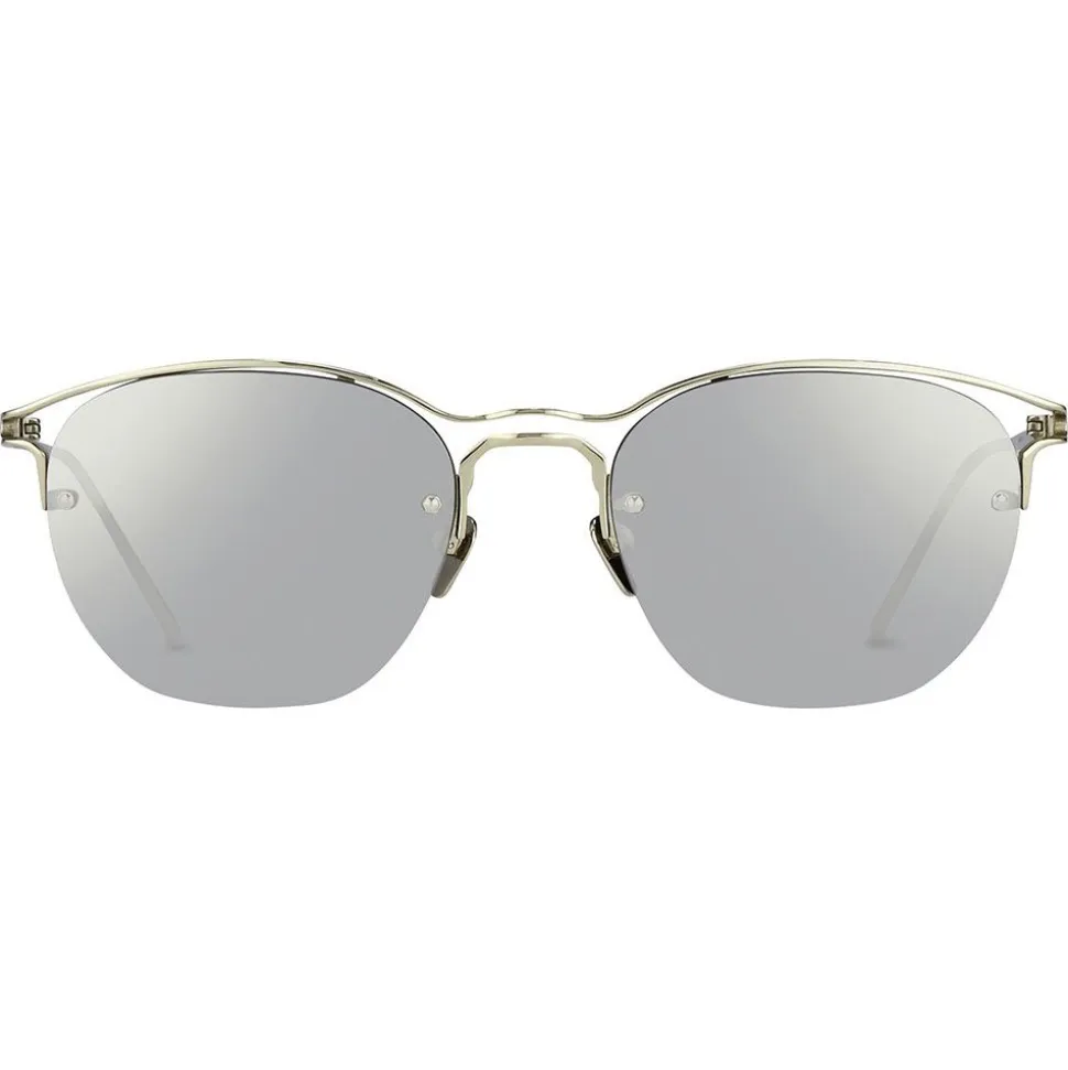 Handcrafted from 18-22 carat white gold-plated Japanese titanium, these Linda Farrow browline sunglasses are the epitome of sophistication. With co-ordinating gold precious lenses, these sunglasses feature an innovative outlined top frame which creates a floating lenses effect.