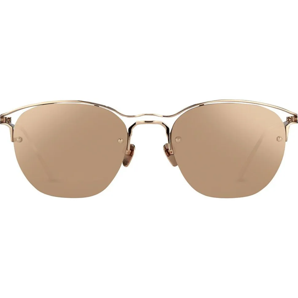 Handcrafted from 18-22 carat rose gold-plated Japanese titanium, these Linda Farrow browline sunglasses are the epitome of sophistication. With co-ordinating gold precious lenses, these sunglasses feature an innovative outlined top frame which creates a floating lenses effect.