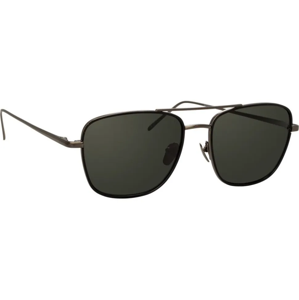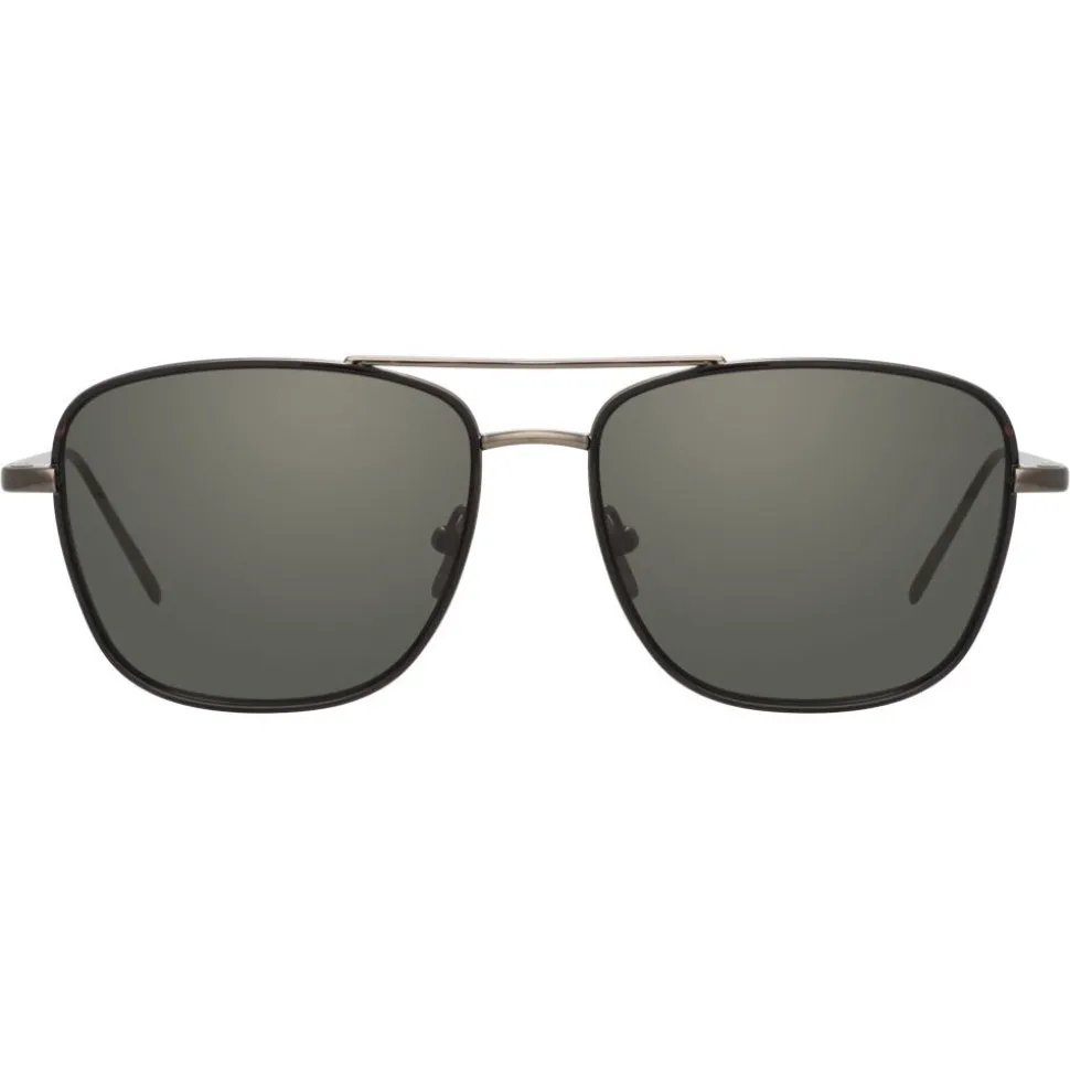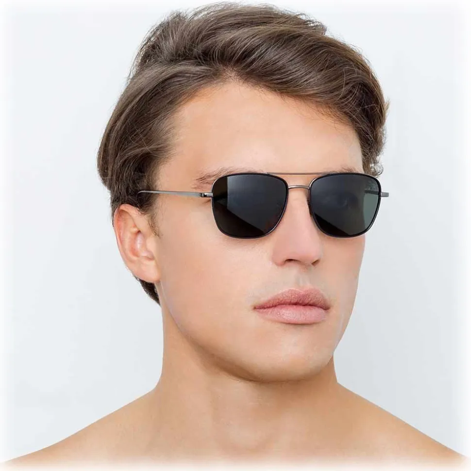 Taking influence from Slim Aarons’ portraits of the international elite in their exclusive poolside playgrounds, these men’s rectangular aviator sunglasses are crafted from luxurious 18-22 carat nickel-plated hypoallergenic lightweight titanium. Dark grey nylon lenses are contoured with black Italian acetate inner windsor rims.
