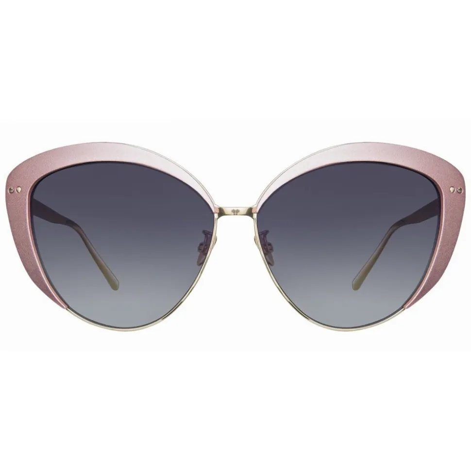 In a retro-inspired cat eye silhouette, these luxurious sunglasses encapsulate the hallmarks of the Linda Farrow aesthetic. Winged pastel pink aluminium frames contour grey gradient nylon lenses, creating a striking contrast to slim temples and a curved nose bridge crafted from 18-22 carat yellow gold-plated lightweight titanium.