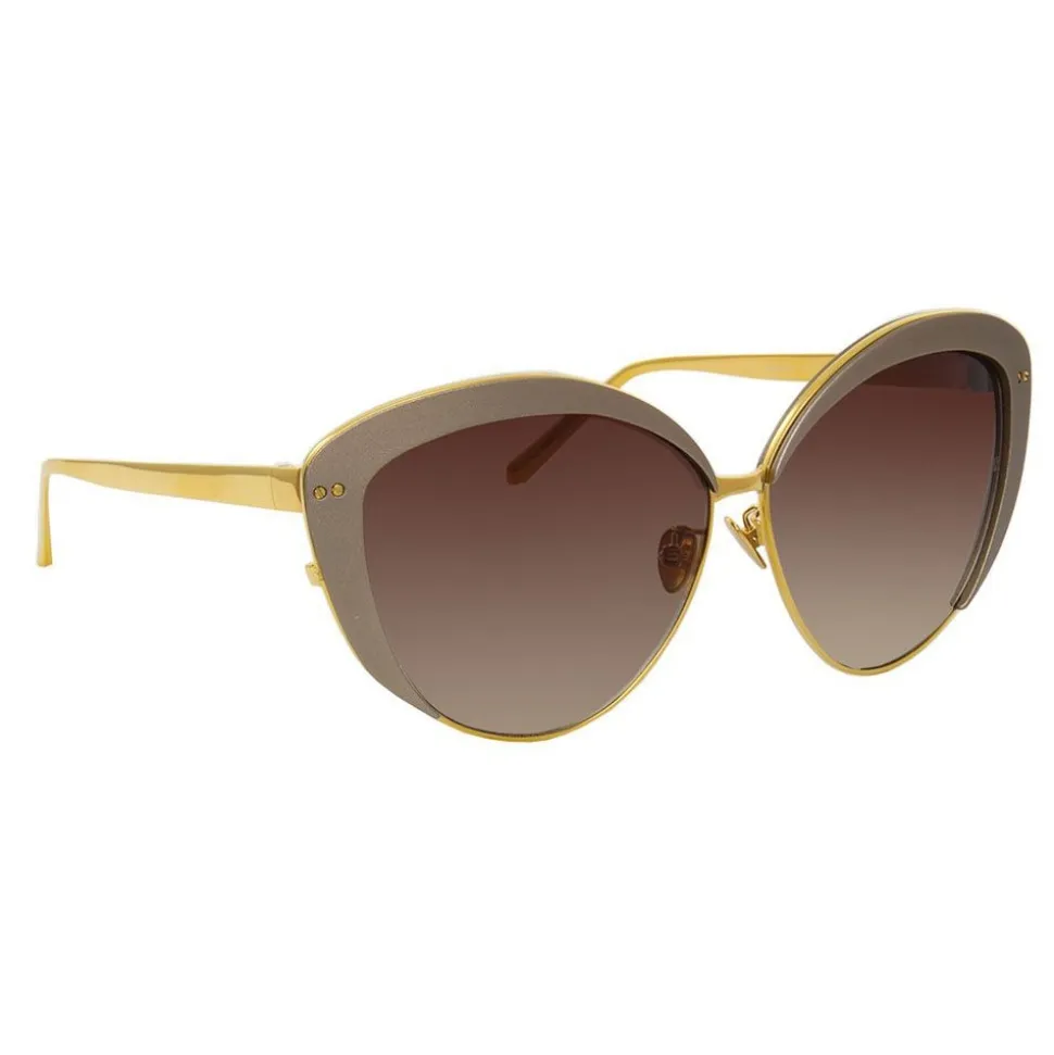 In a retro-inspired cat eye silhouette, these luxurious sunglasses encapsulate the hallmarks of the Linda Farrow aesthetic. Winged taupe aluminium frames contour brown gradient nylon lenses, creating a striking contrast to slim temples and a curved nose bridge crafted from 18-22 carat yellow gold-plated lightweight titanium.