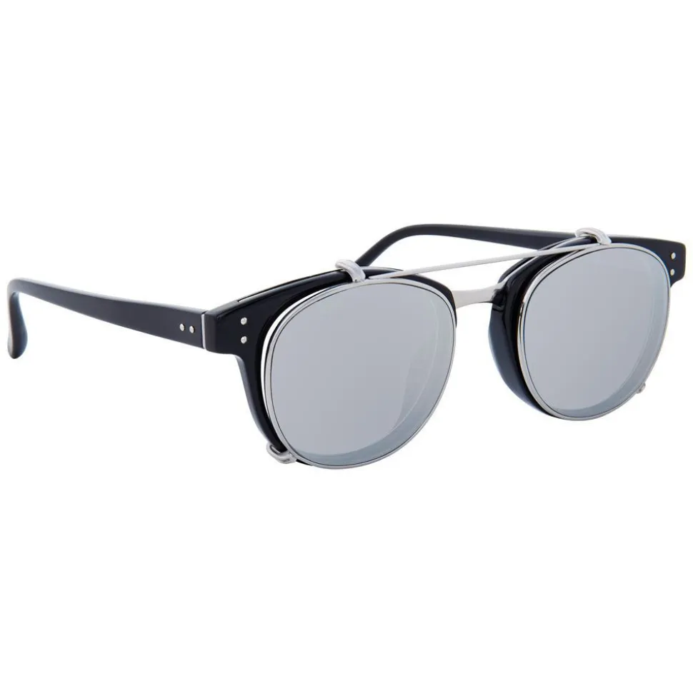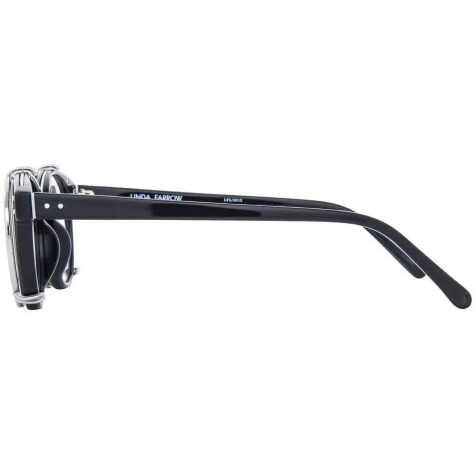 Reinventing the browline silhouette, these unique Linda Farrow optical glasses are easily transformed with an innovative clip-on flat sunglasses feature. Flat platinum precious lenses are outlined with 18-22 carat white gold plated titanium rims, top bar and clips which attach to hand polished black Italian acetate frames.