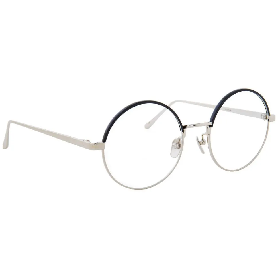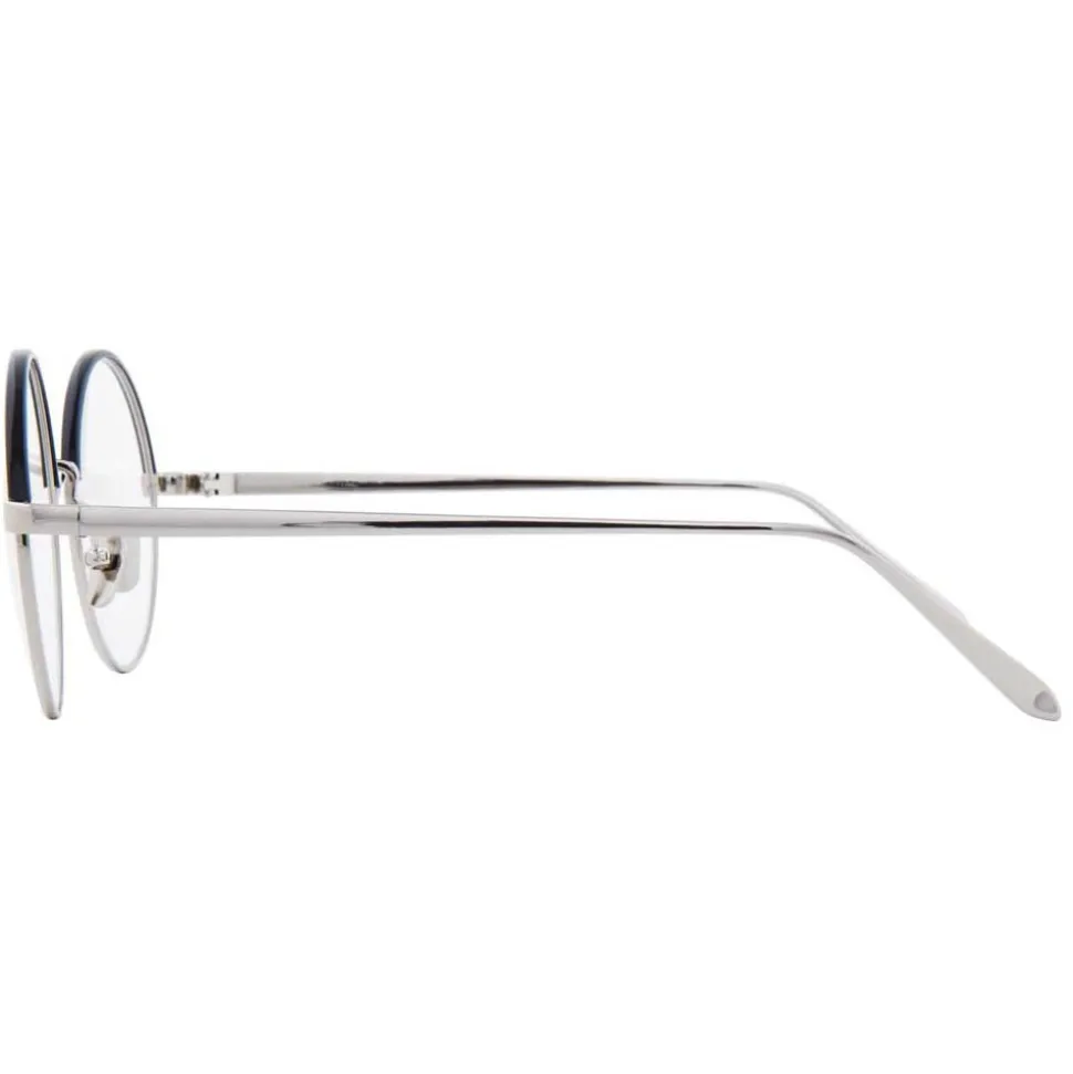 Smooth and sleek, these luxurious unisex round Linda Farrow optical glasses are handcrafted with 18-22 carat white gold plated titanium frames, contoured with a black Italian acetate half Windsor rim. Streamlined, co-ordinating slim temples are tapered with Japanese bulb tips. Adjustable nose pads provide superior levels of comfort, with the Linda Farrow logo in signature white inset in the inside of the temple.
