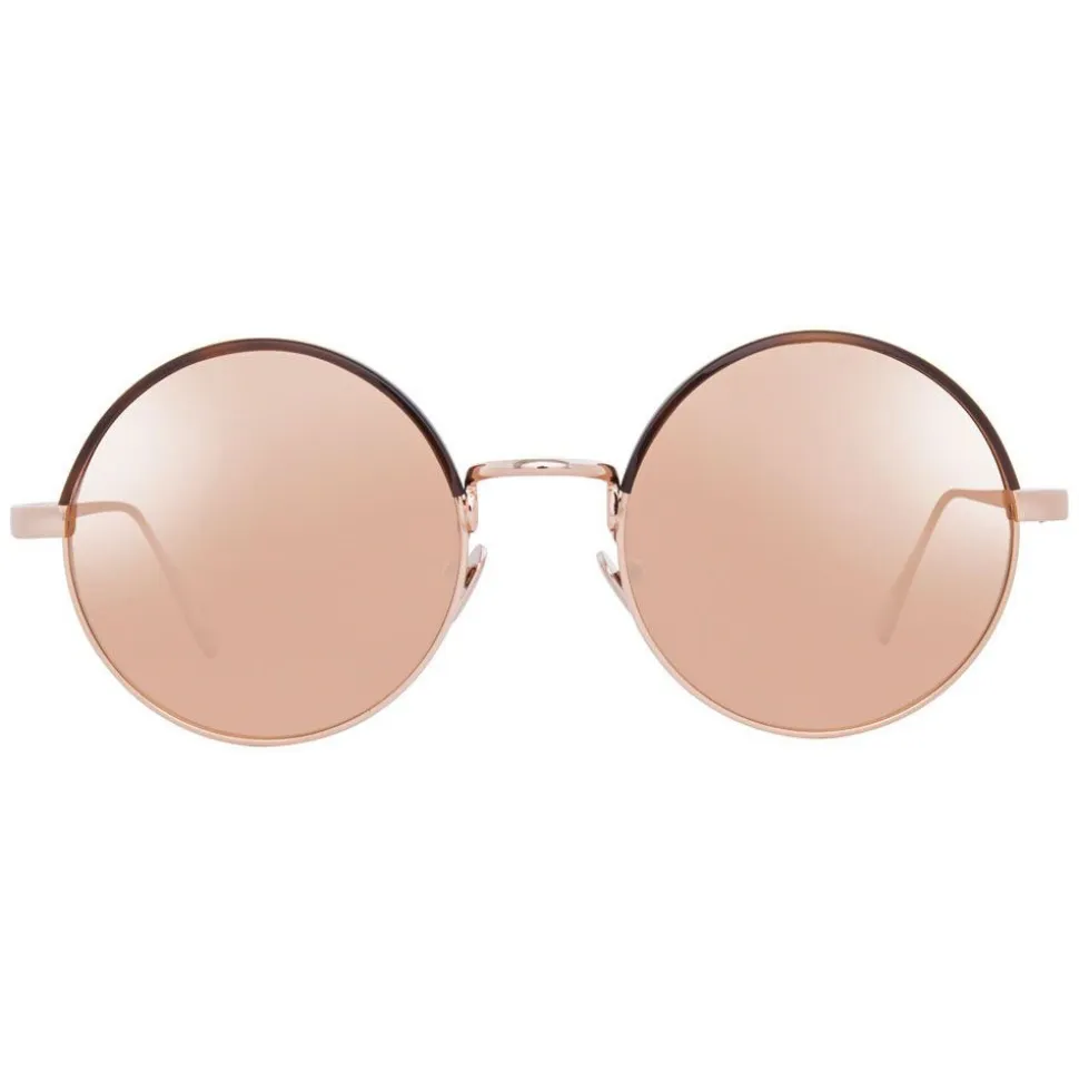 Smooth and sleek, these luxurious unisex round Linda Farrow sunglasses are handcrafted with rose gold precious lenses and 18-22 carat rose gold plated titanium frames, contoured with a mocha Italian acetate half Windsor rim.