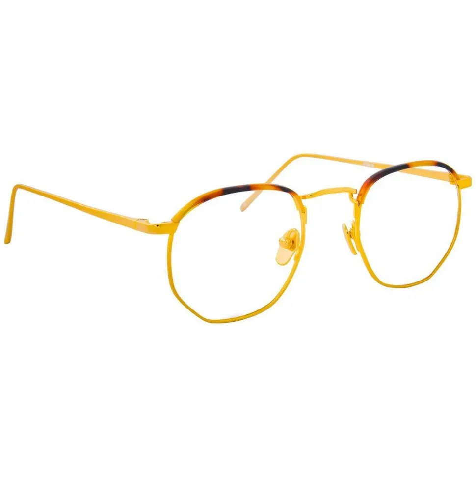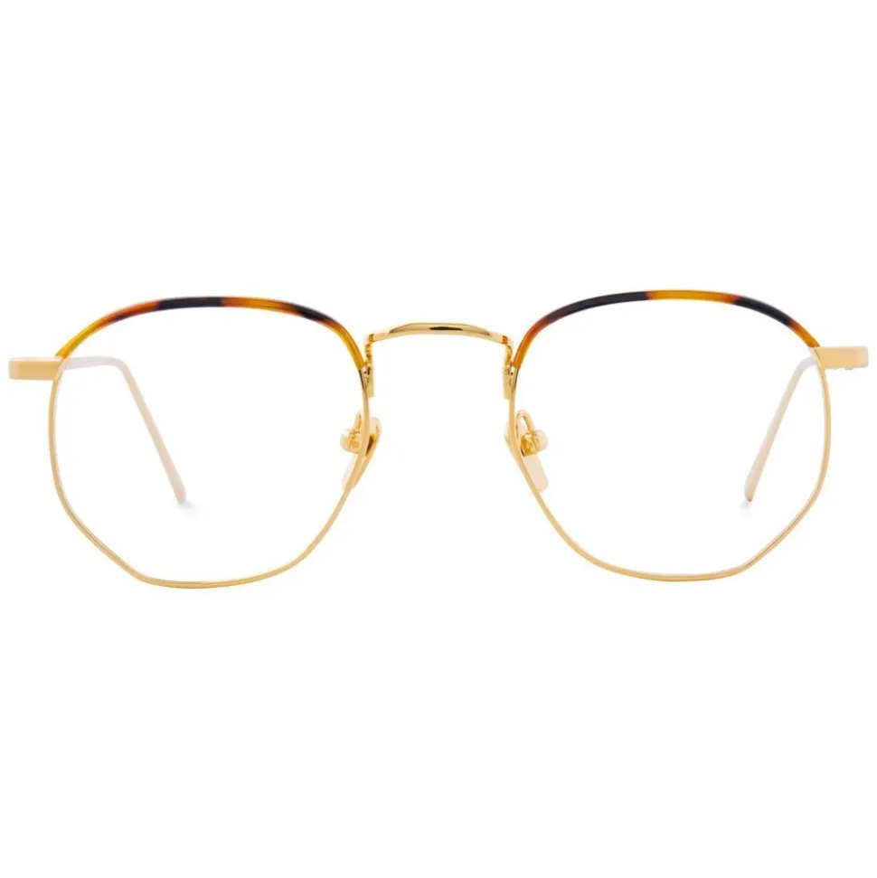 These angular Linda Farrow optical glasses are handcrafted with 18-22 carat yellow gold plated titanium frames, contoured with a tortoiseshell Italian acetate half Windsor rim. With a raised feature nose bridge, streamlined, co-ordinating slim temples are tapered with characteristic Japanese bulb tips, with the Linda Farrow logo in signature white inside of the temple. Adjustable nose pads provide superior levels of comfort.